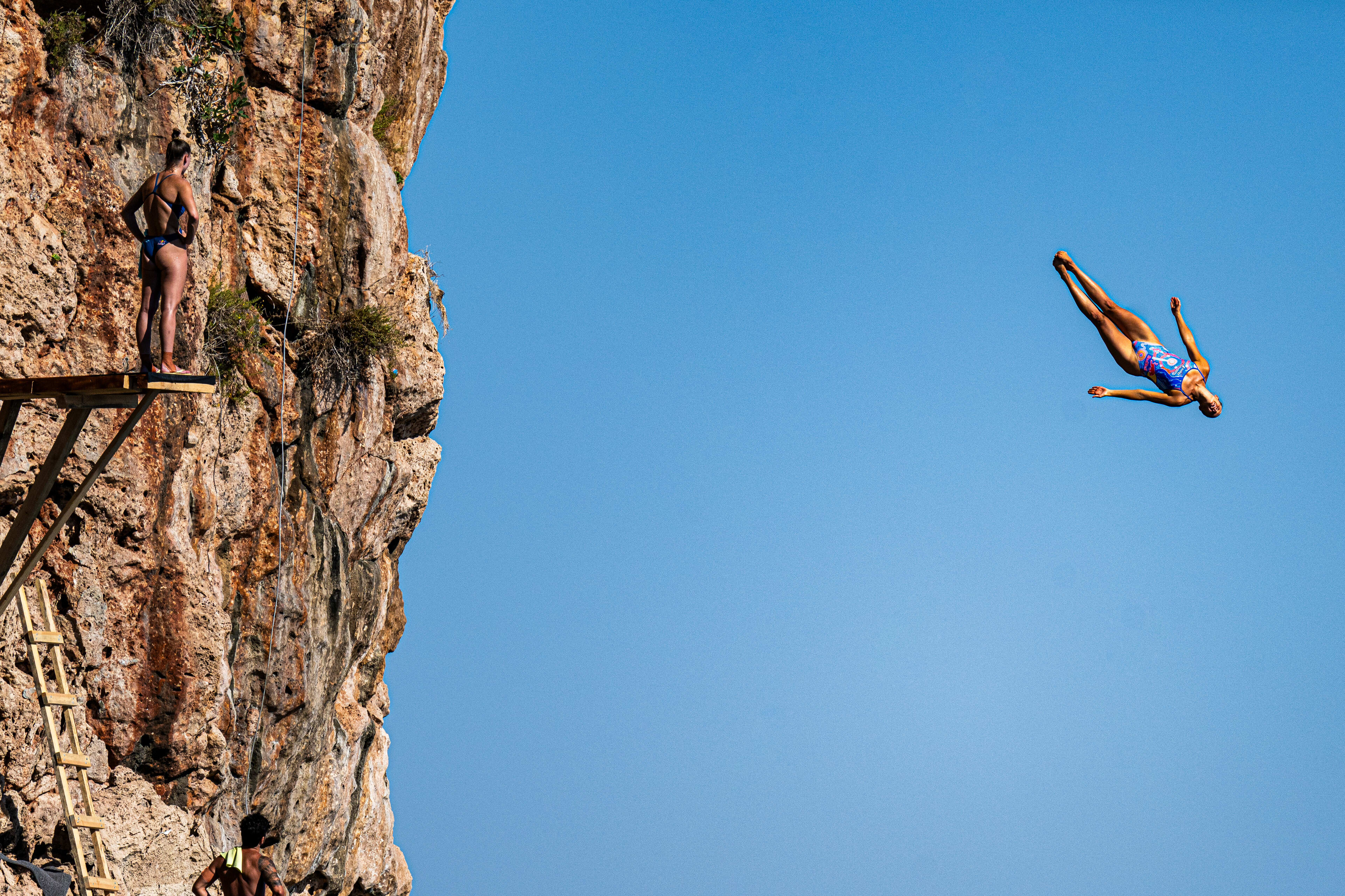 “Mentally, it's a whole different ball game,” says Rhi. “There’s a lot more going through your mind when you're standing on 20 metres in comparison to 10 metres. So when I made the transition [to cliff diving], that was the hardest thing to adapt to at first, and to understand that it was a normal reaction that when you're standing there, you are going to go through the rush of emotions, adrenaline, fear, all of those sorts of things.”
