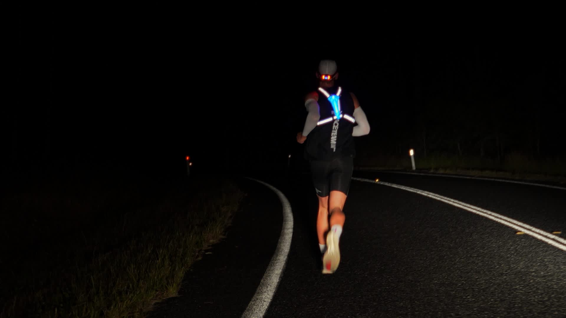 As the final fixed segment approached, darkness settled in. The temperature dropped sharply, frost forming across the ground. Twenty-one kms of dirt road lay ahead, undulating, exposed and completely black. One runner, alone, with only a support vehicle trailing behind.