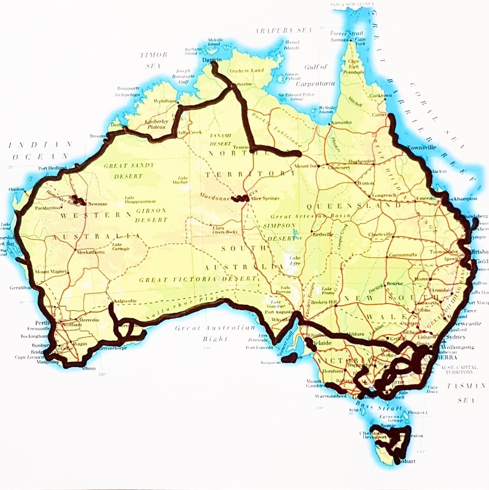 Tasmania was the warm up lap. 1,250 kilometres following roads, 4WD tracks, walking tracks and beaches around the coast and through the mountains. I started and finished this leg in Devonport, 10 weeks between October and December. It didn't always go to plan and I added extra detours and side trips as I went. A depression relapse forced me to stop several times and just as I was about to set off up the west coast, I came down with a flu which turned into pneumonia. I also wanted to be the first person walking around Australia to walk properly ‘around’ Tasmania, all previous walkers, if they bother to include Tassie, went across the centre.