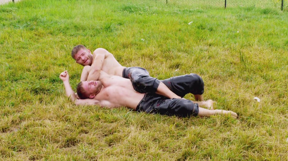 Well, that’s not quite right. Both fighters are naked from the waste up, their legs wrapped in sodden buffalo-leather trousers, tied at the knee with twine. But the slick of extra virgin rubbed over every deltoid does add a suggestive machismo that’s hard to shake. It’s probably the most naked you can be while still wearing pants.