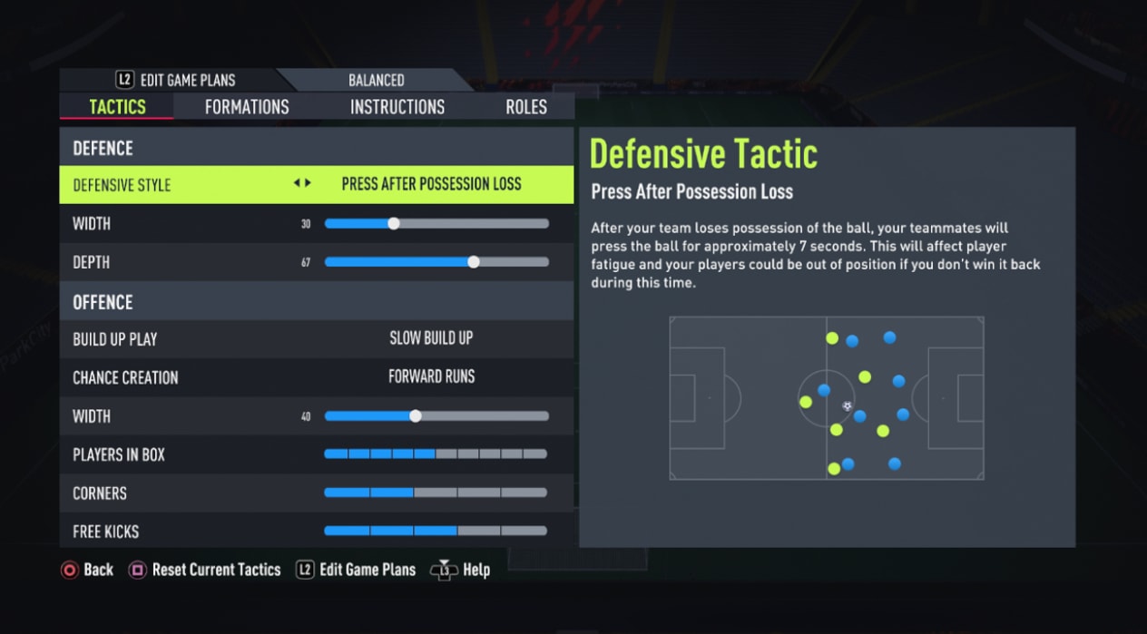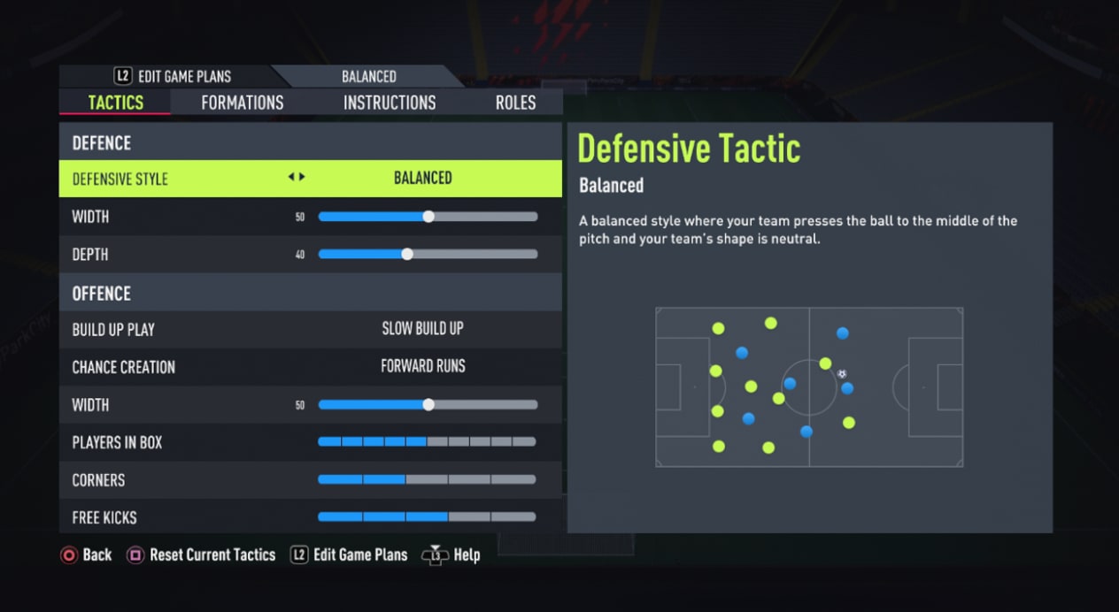 La combinaison d'une montée en puissance lente et de courses offensives garantit que tu peux faire quelque chose à la fois offensivement et défensivement. Assure-toi que tes corners sont bien bas. Les contres qui peuvent provenir d'un corner offensif sont très dangereux, il vaut donc mieux garder tes joueurs un peu en arrière.