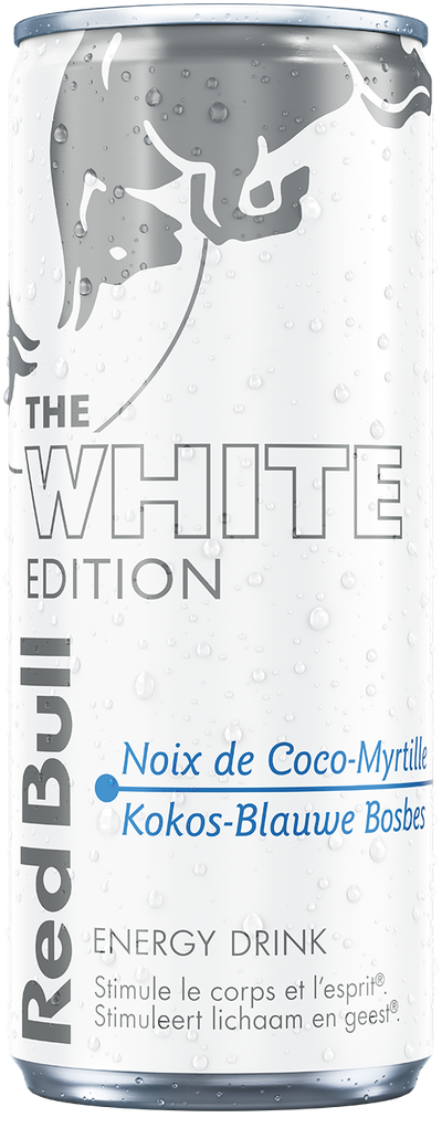 De Red Bull White Edition met de smaak van kokos-blauwe bosbes.