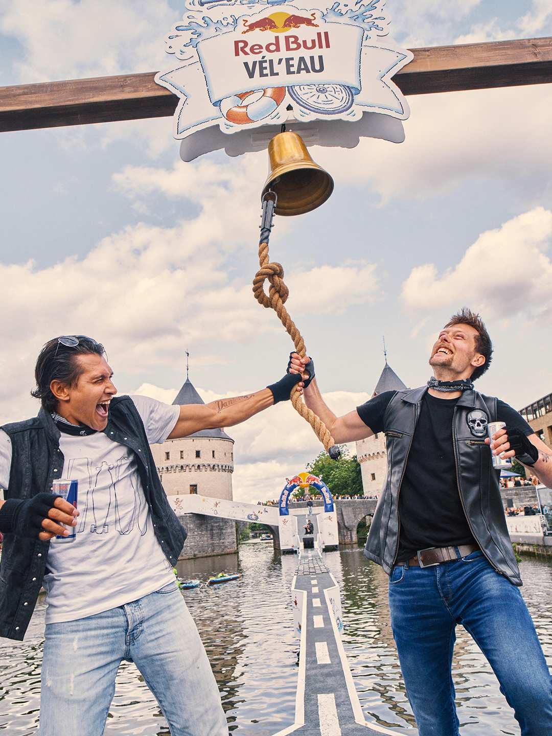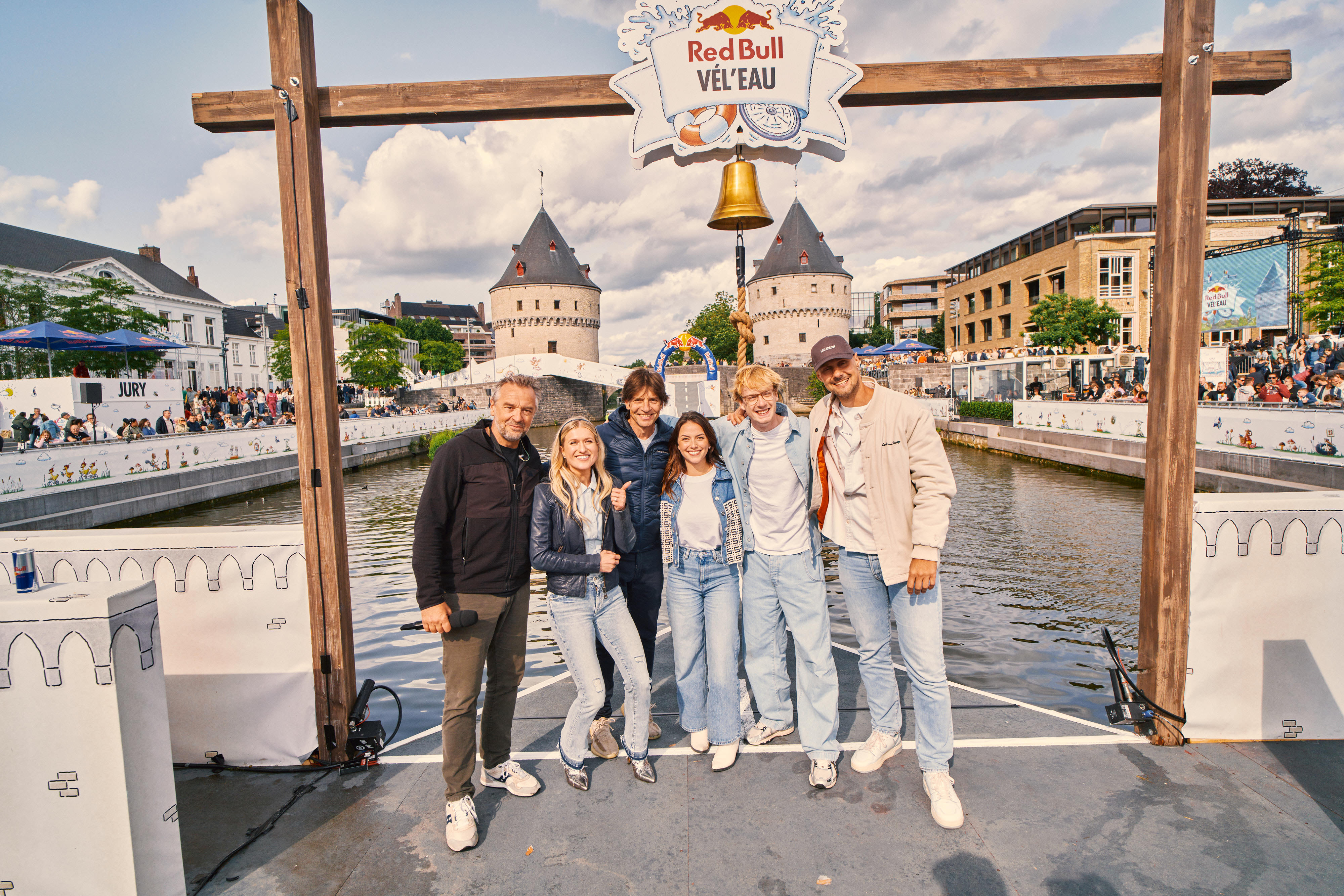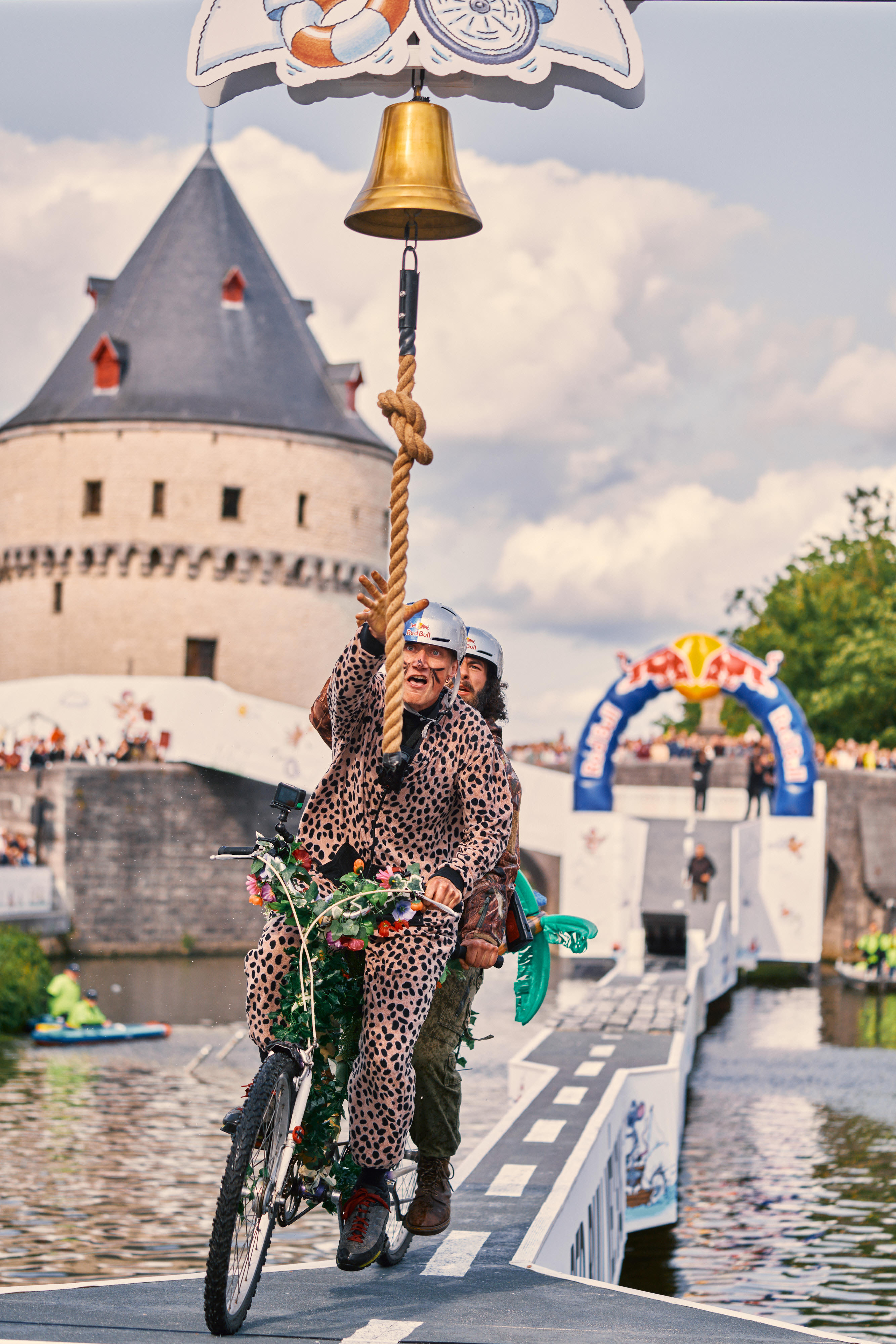 34 prettig gestoorde en dito uitgedoste teams zoefden vandaag onder het gejoel van duizenden aanwezigen over het verraderlijke parcours van Red Bull Vél'eau aan de iconische Broeltorens in Kortrijk. Een voor een probeerden dappere duo's op hun zelfgemaakte tweewieler vijf obstakels te overwinnen midden op de Leie. Hun doel? De bel luiden aan de finish én het droog houden. Hosts Tom Waes, Koen Wauters en Lies Vandenberghe zagen met pretlichtjes in de ogen hoe dat vaker niet dan wel lukte, terwijl juryleden Tom Boonen, Timon Verbeeck, Shauna Dewit en Britt Dekker punten gaven op design. Het waren uiteindelijk De Zusters Van de Wet uit Lauwe bij Kortrijk die met die prijs aan de haal gingen. Harley Dafietson uit Delft - de winnaars van de editie in Nederland - zetten met 12.85 seconden de snelste tijd neer.