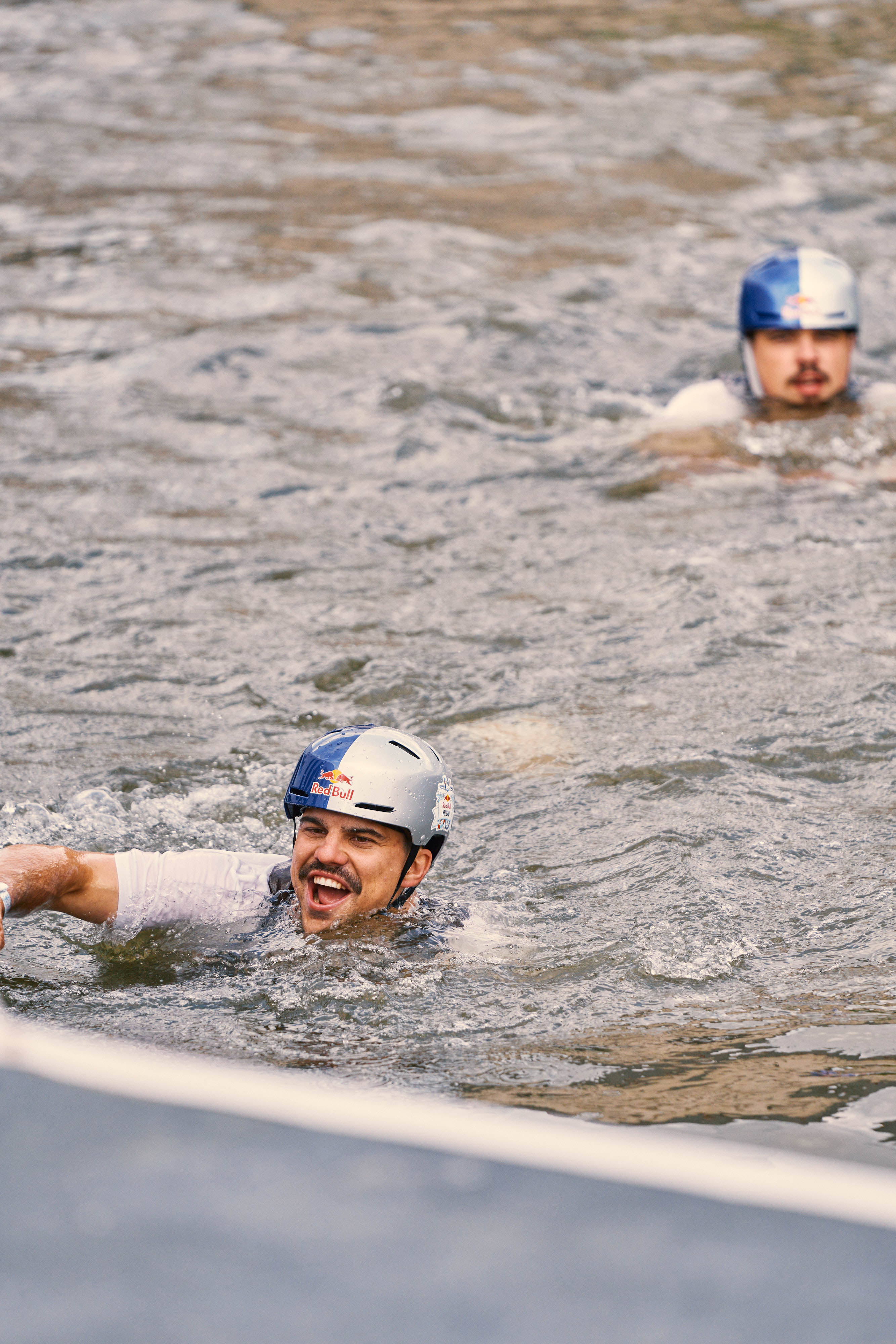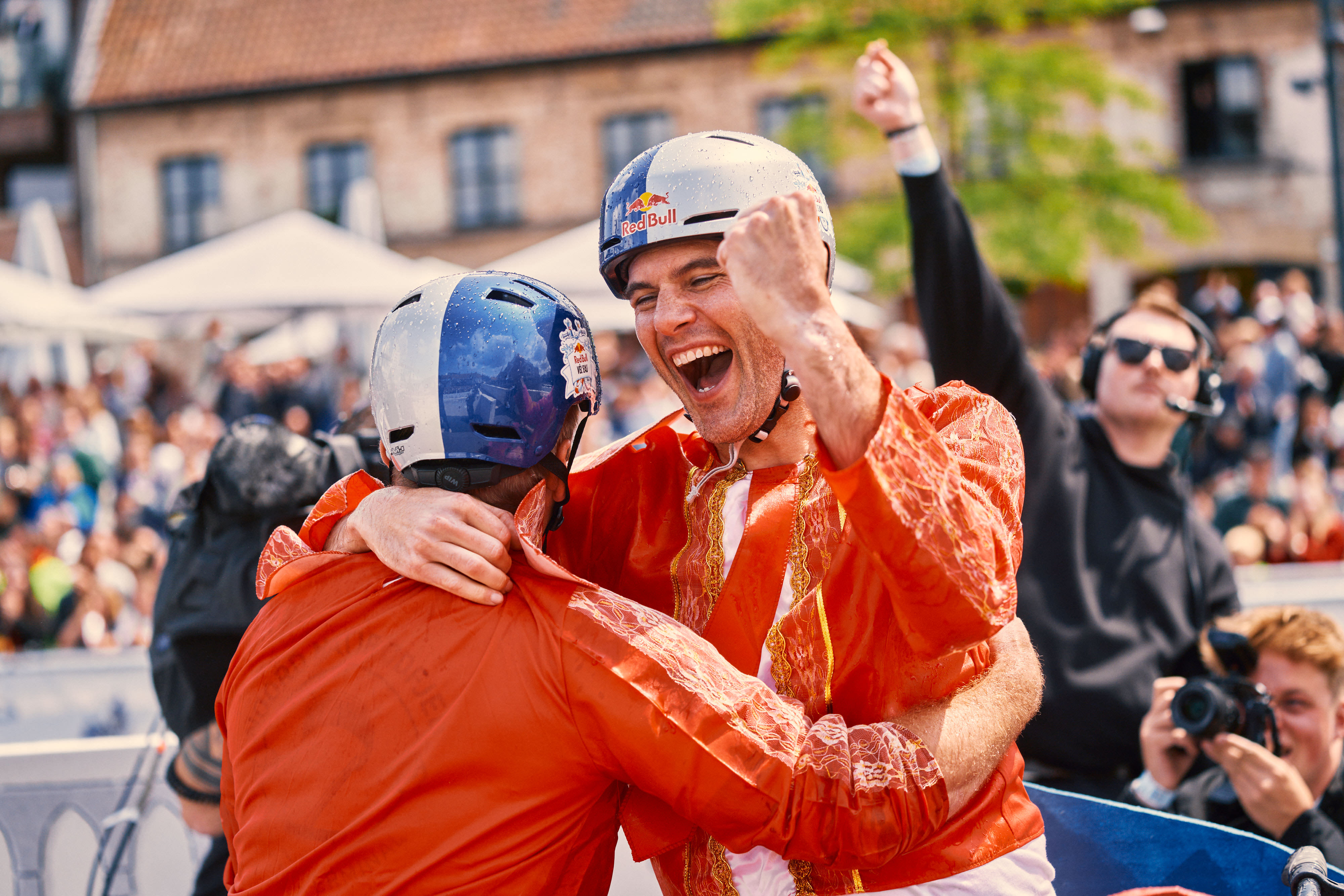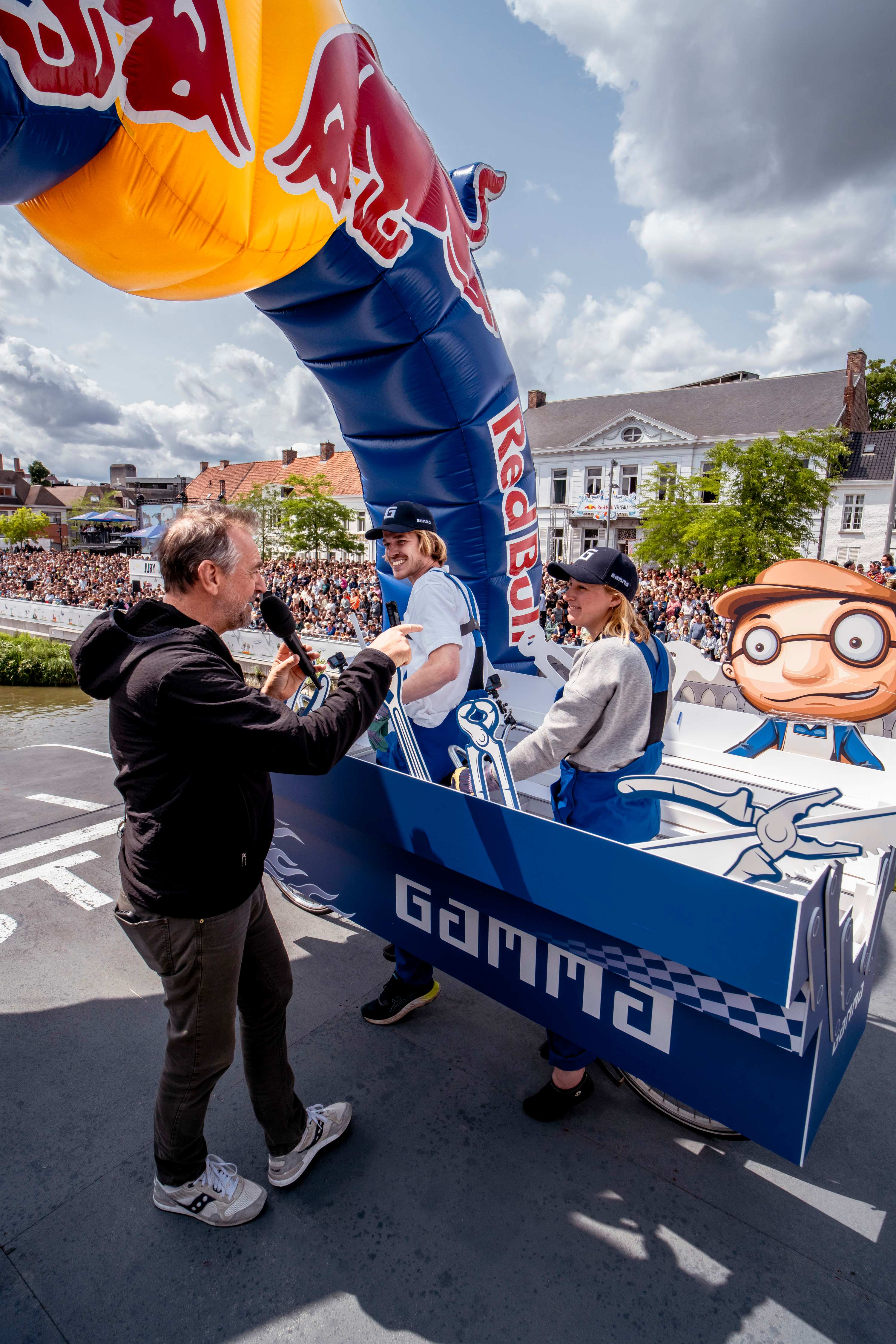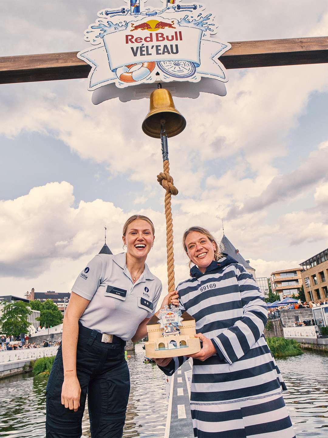 34 prettig gestoorde en dito uitgedoste teams zoefden vandaag onder het gejoel van duizenden aanwezigen over het verraderlijke parcours van Red Bull Vél'eau aan de iconische Broeltorens in Kortrijk. Een voor een probeerden dappere duo's op hun zelfgemaakte tweewieler vijf obstakels te overwinnen midden op de Leie. Hun doel? De bel luiden aan de finish én het droog houden. Hosts Tom Waes, Koen Wauters en Lies Vandenberghe zagen met pretlichtjes in de ogen hoe dat vaker niet dan wel lukte, terwijl juryleden Tom Boonen, Timon Verbeeck, Shauna Dewit en Britt Dekker punten gaven op design. Het waren uiteindelijk De Zusters Van de Wet uit Lauwe bij Kortrijk die met die prijs aan de haal gingen. Harley Dafietson uit Delft - de winnaars van de editie in Nederland - zetten met 12.85 seconden de snelste tijd neer.