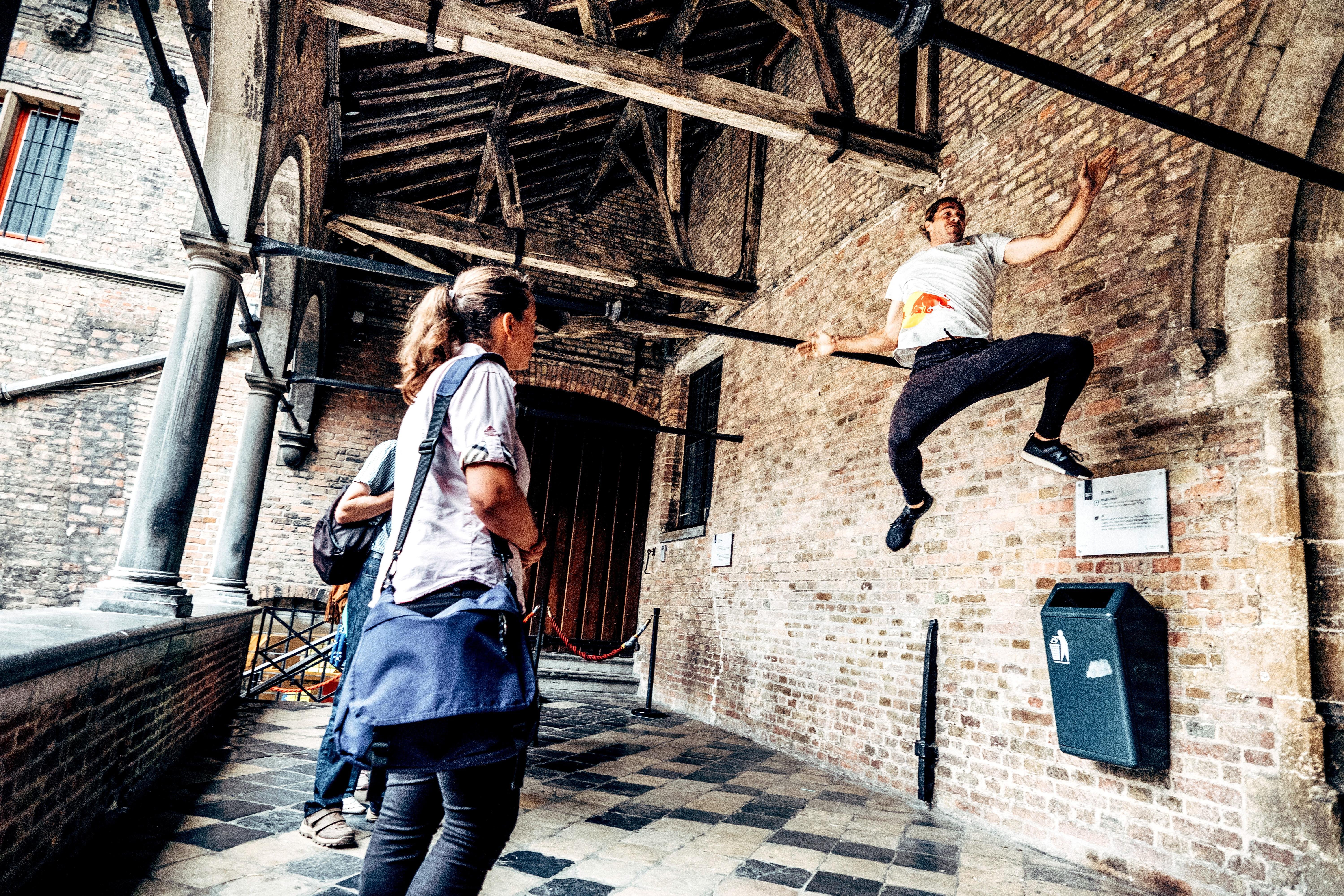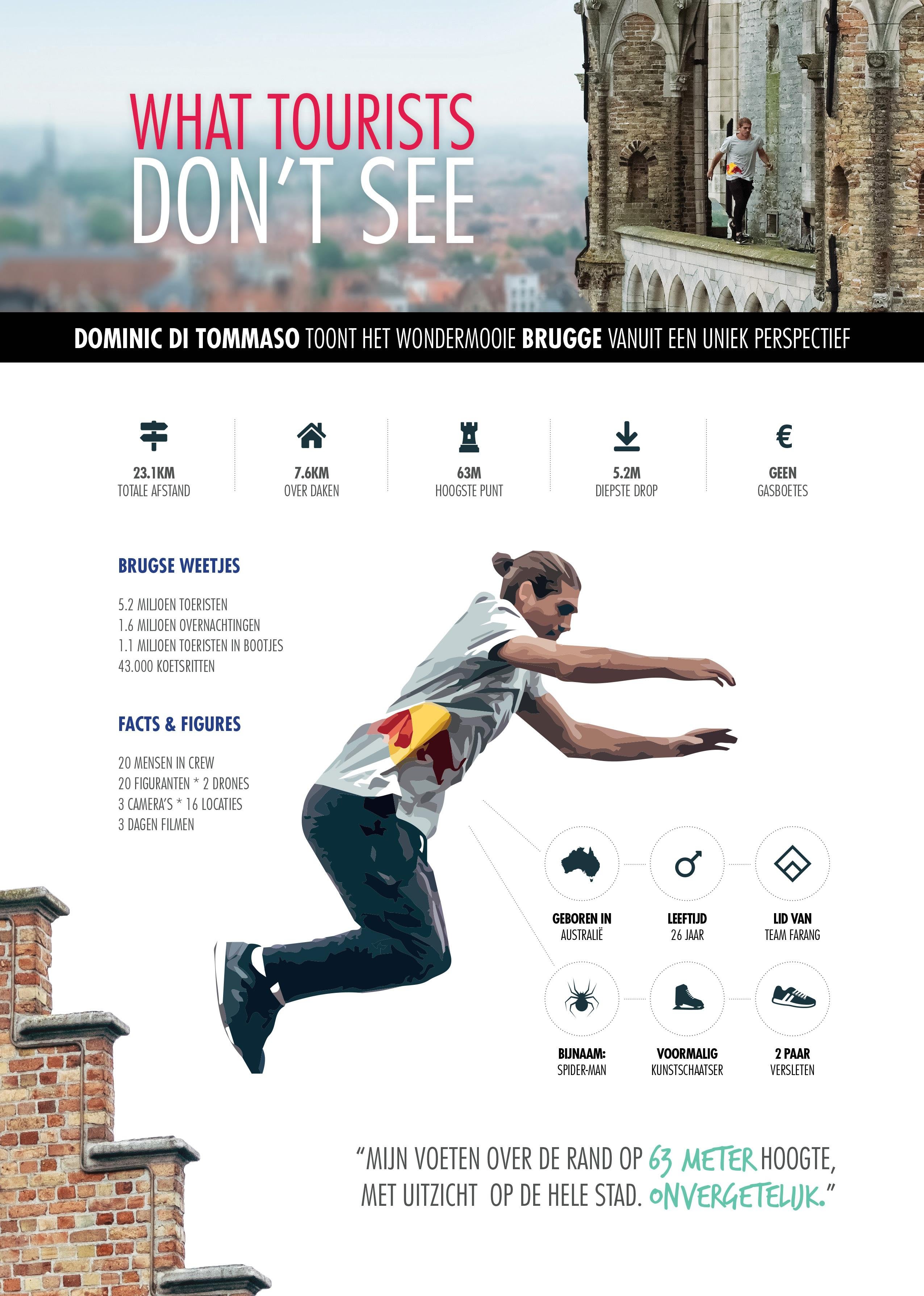 What Tourists Don't See is geïnspireerd op Liquid City, het thema van de lopende Triënnale. Alles beweegt, met de stad als het epicentrum van positieve stedelijke en sociale verandering. Net dat wil atleet Dominic Di Tomasso uitdrukken, want als professioneel freerunner is bewegen zijn leven: een flow waarbij hij voortdurend zijn grenzen, zowel mentaal als fysiek, aftast en pusht. Focus is daarbij het allerbelangrijkste. En vrijheid natuurlijk, met Brugge als ultieme speeltuin.