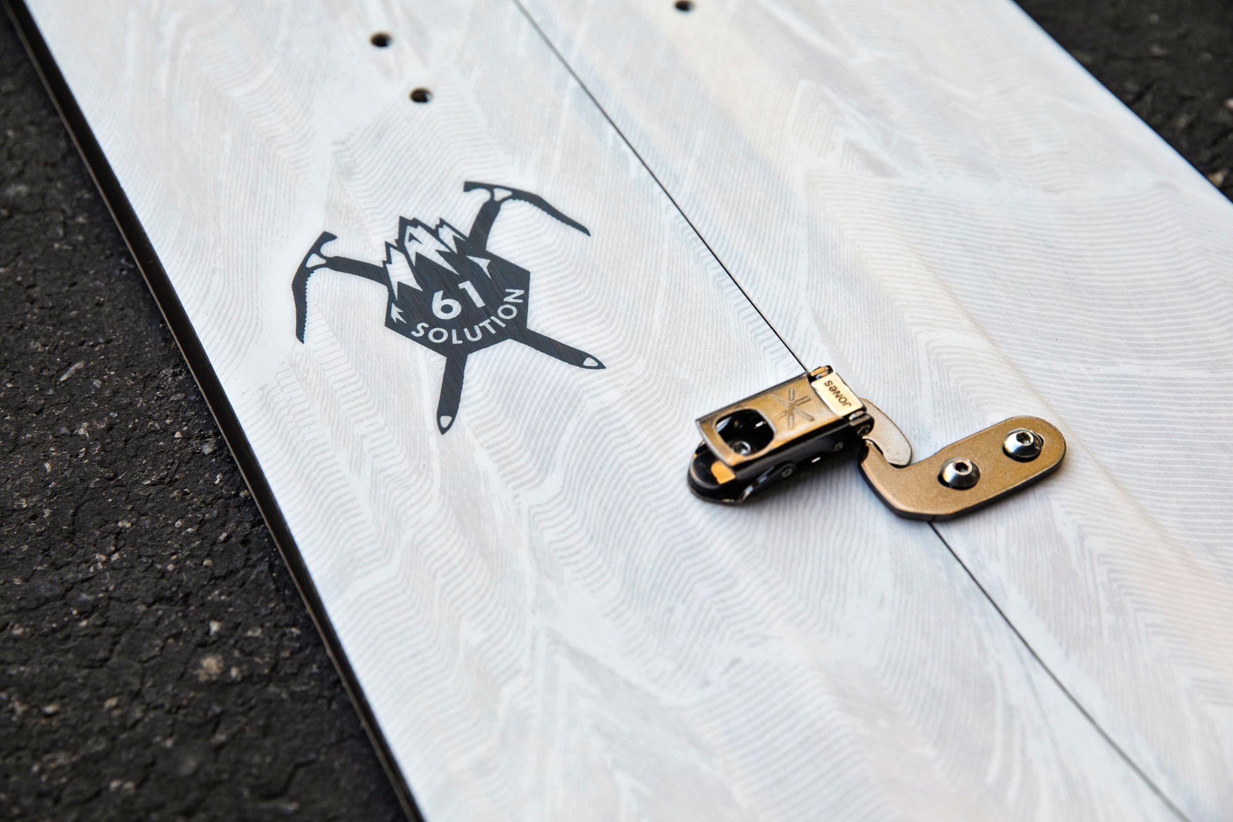 Solid snowboards use 3D contouring to ‘spoon’ the nose for better performance, but no splitboard has had that until now. “It took five years,” says Jones, “and at times I questioned if it was possible.”The split is closed with a bridge that eliminates the need to drill bolts through it. “This makes for a way