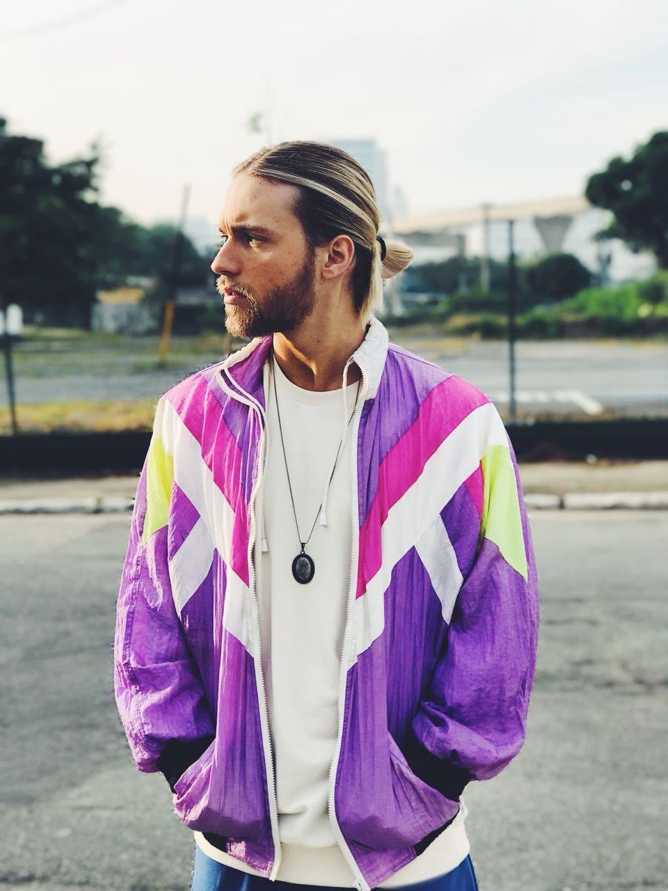 No look 4 o destaque é a bomber jacket. Essas jaquetas meio anos 80 estão voltando com tudo e esse modelo colorido é a cara do carnaval.
