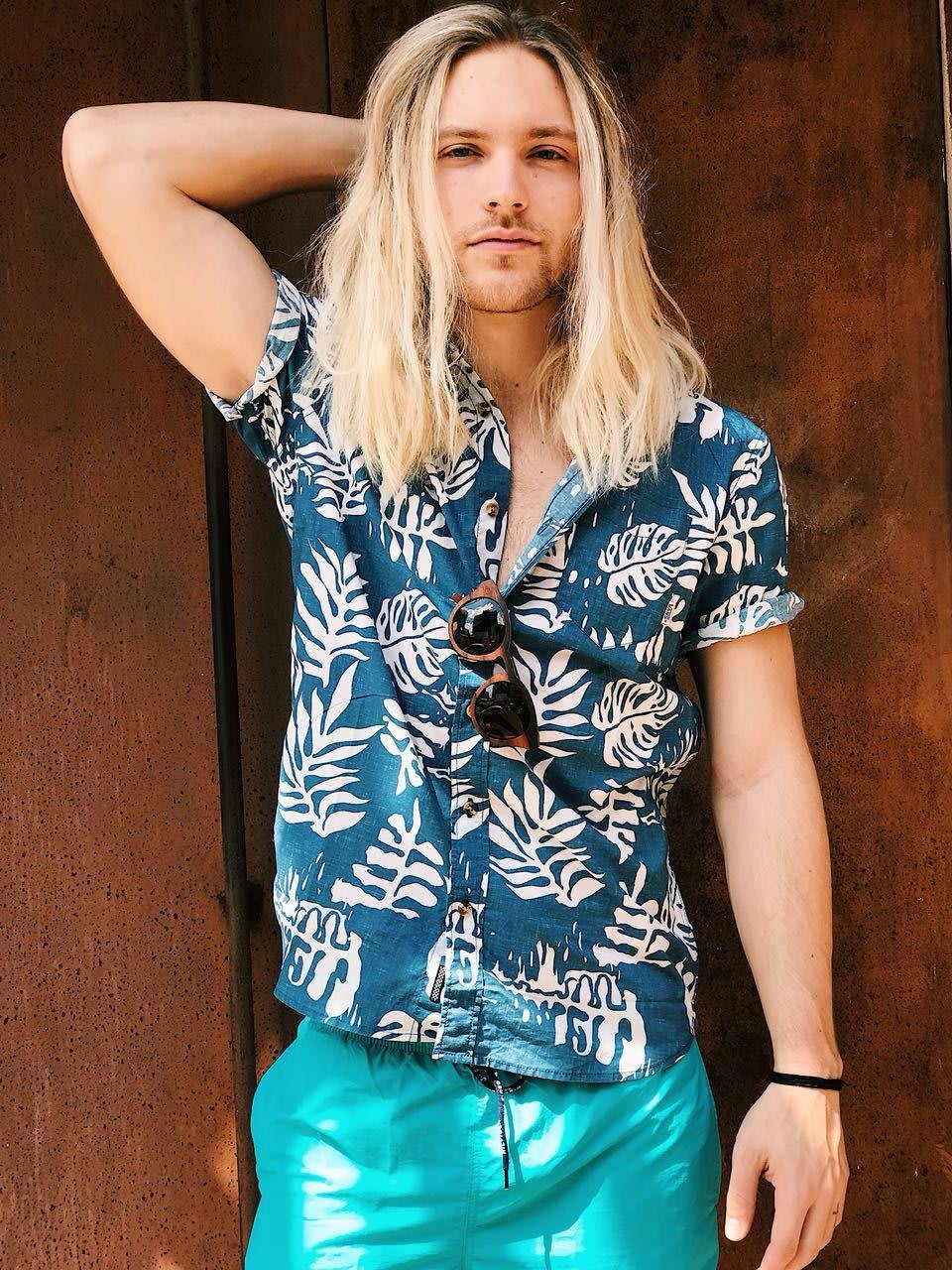 É verão no Brasil, então a dica pro look 2 é uma pegada mais praieira, despojada e com cores vibrantes. Aqui estou usando dois tons de azul sobrepostos, que fica super legal. Vale usar camisas com estampas tropicais, que super combinam com a vibe quente do carnaval e da estação.
