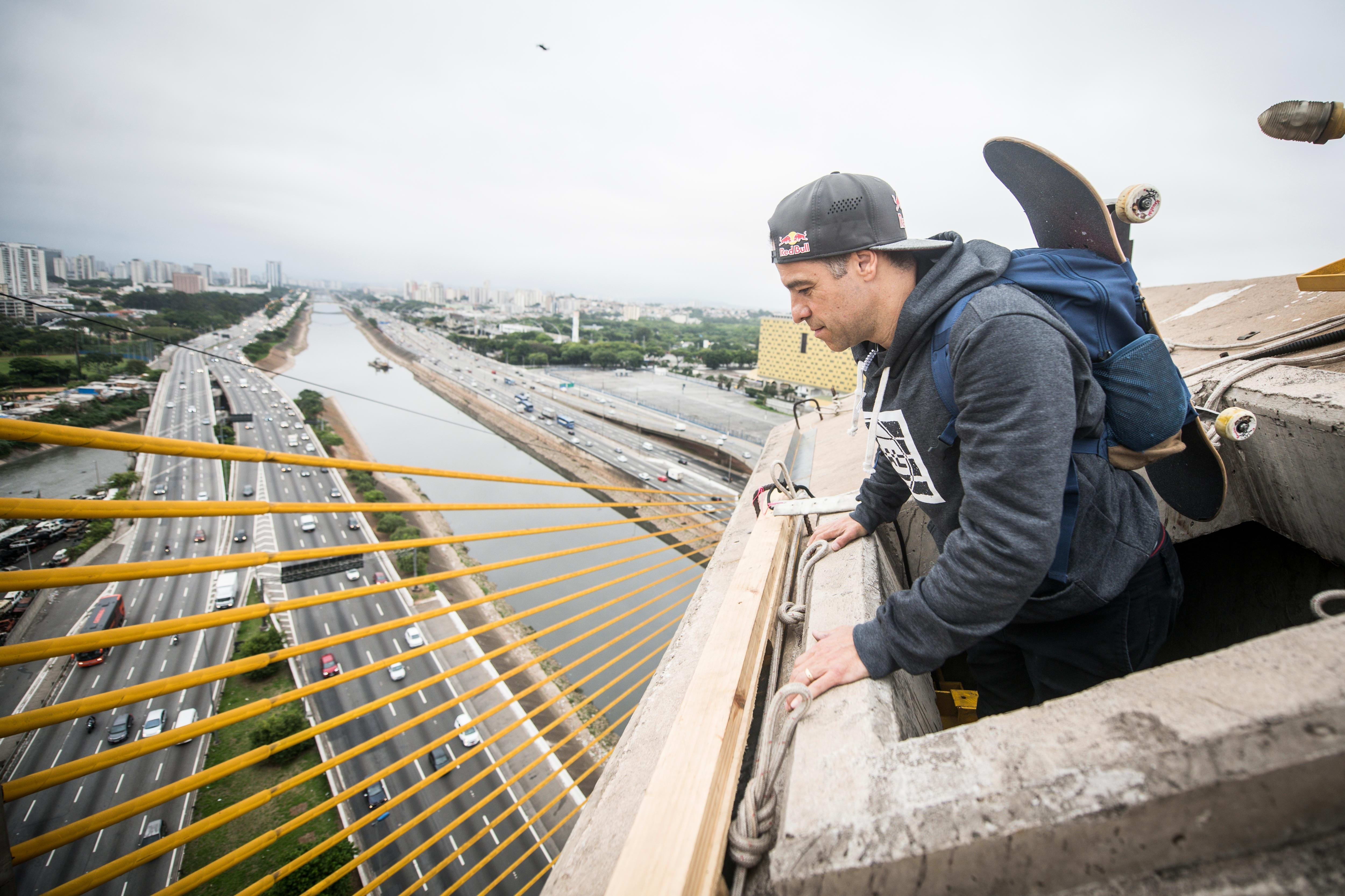 Em novembro de 2019, o rei da transição fez muito barulho com o drop insano a 30m de altura na Ponte Estaiadinha, na Marginal Tietê, em São Paulo. Sua bagagem deu forças pra realizar o feito inédito, encarando o desafio da altura pra manobrar numa rampa estreita de 3m de largura e descer a ponte de rapel.