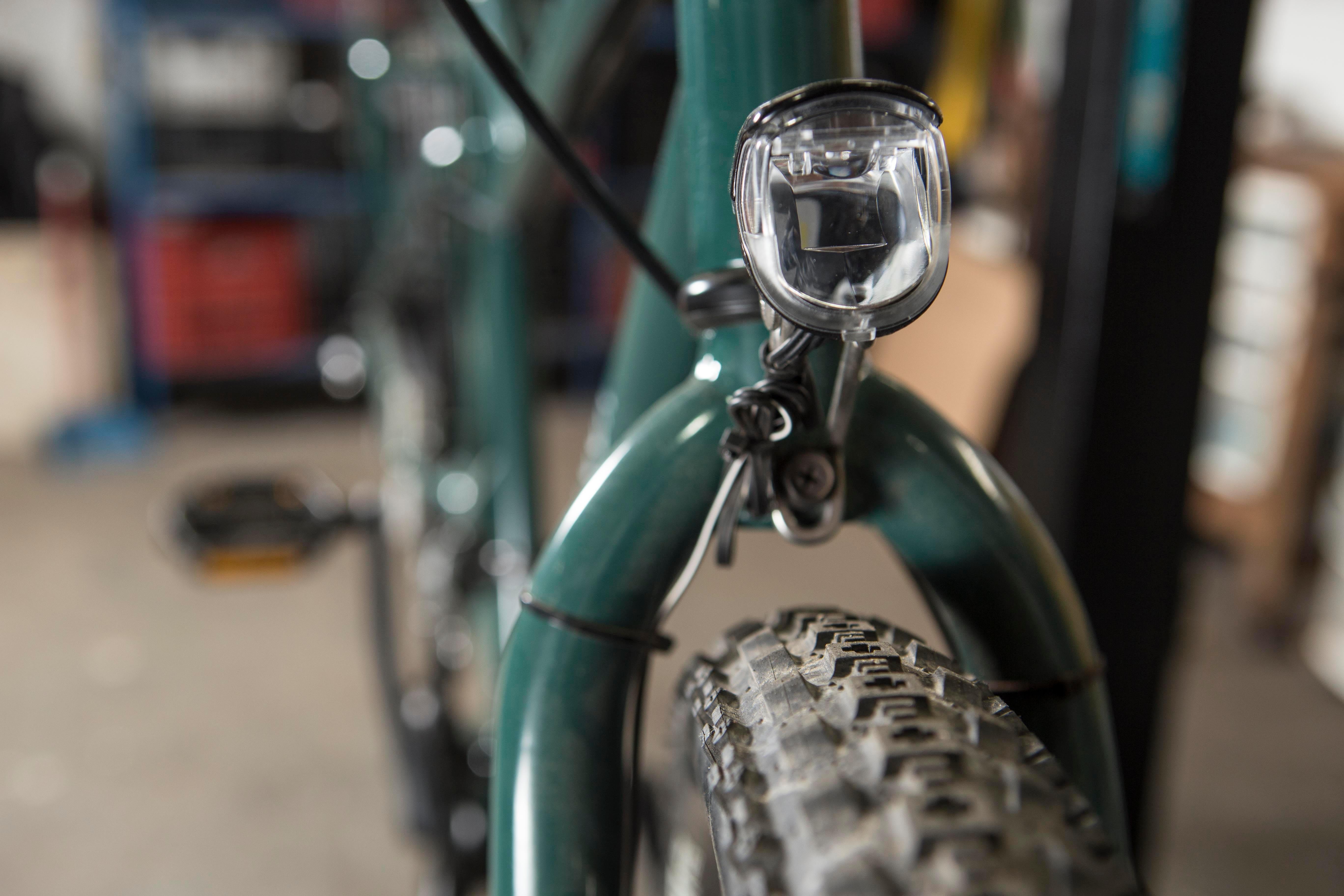 A cargueira do Bornia & Cox foi montada com uma tubulação de aço liga 1020, sistema de iluminação acionado por dinâmo da Shimano Alfine, cavalete de sustenção e guidão levemente curvado para trás.