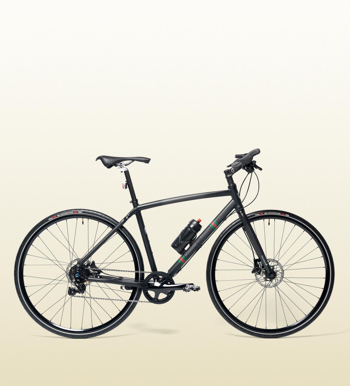 A grife Gucci juntou-se a tradicional fabricante italiana Bianchi para criar uma bike urbana moderna. Esta híbrida foi desenvolvida em parceria com a diretora criativa da Gucci Frida Giannini, com chassi em carbono. O detalje é o capacete Gucci e as luvas Gucci para pedalar. A Bianchi by Gucci também possui outro modelo de bike fixa (monomarcha).