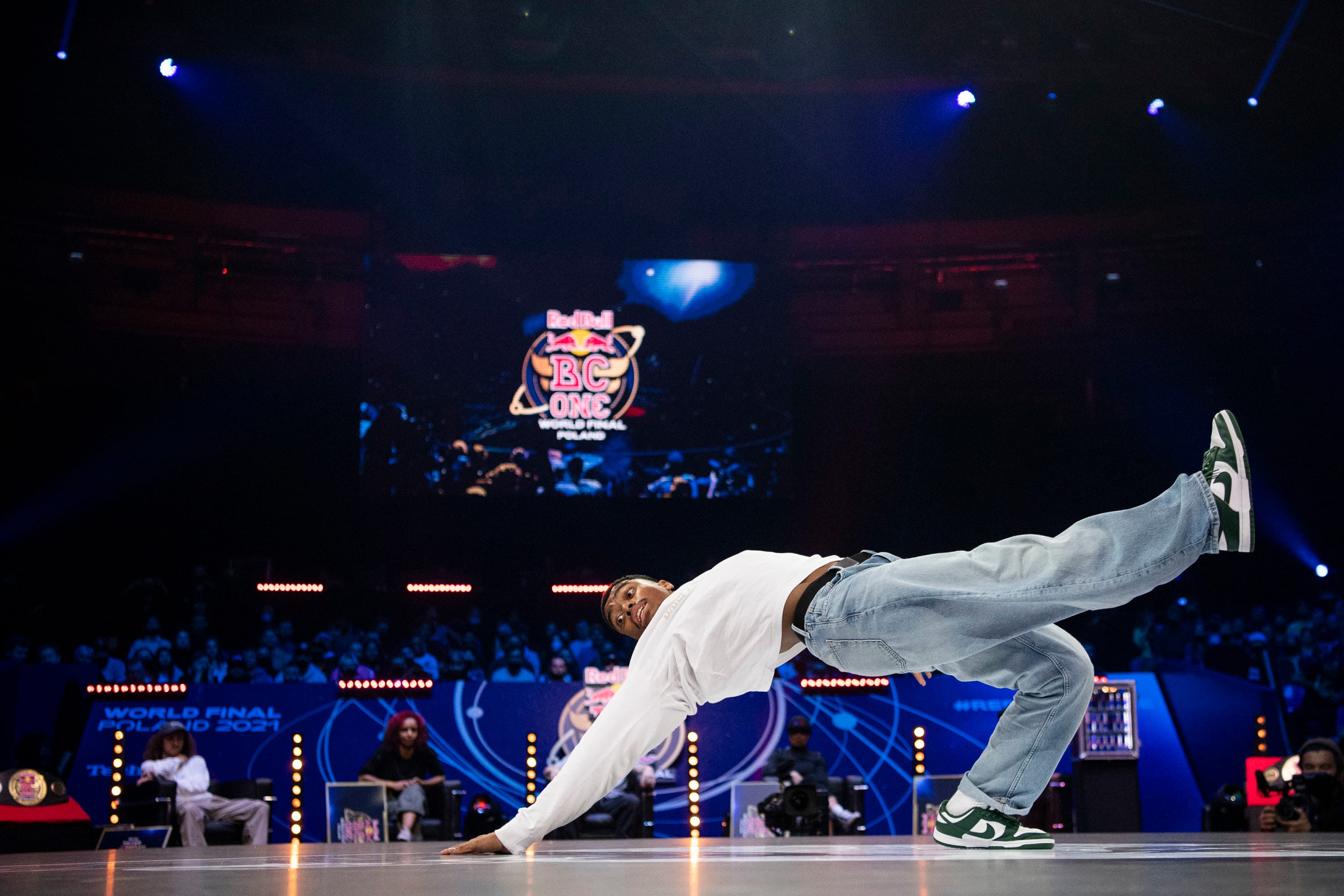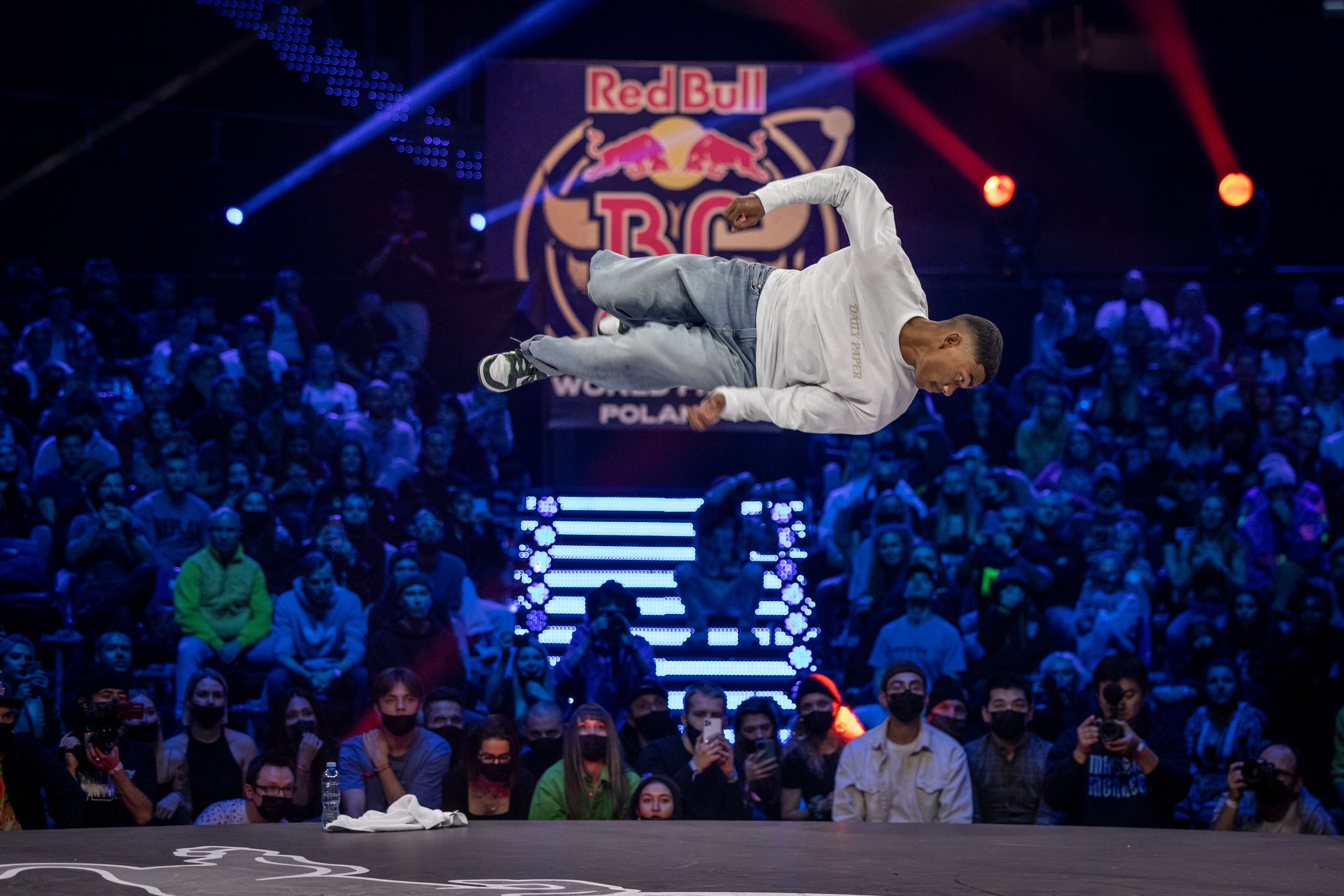 B-Boy Lee voa durante a Final Mundial do Red Bull BC 2021