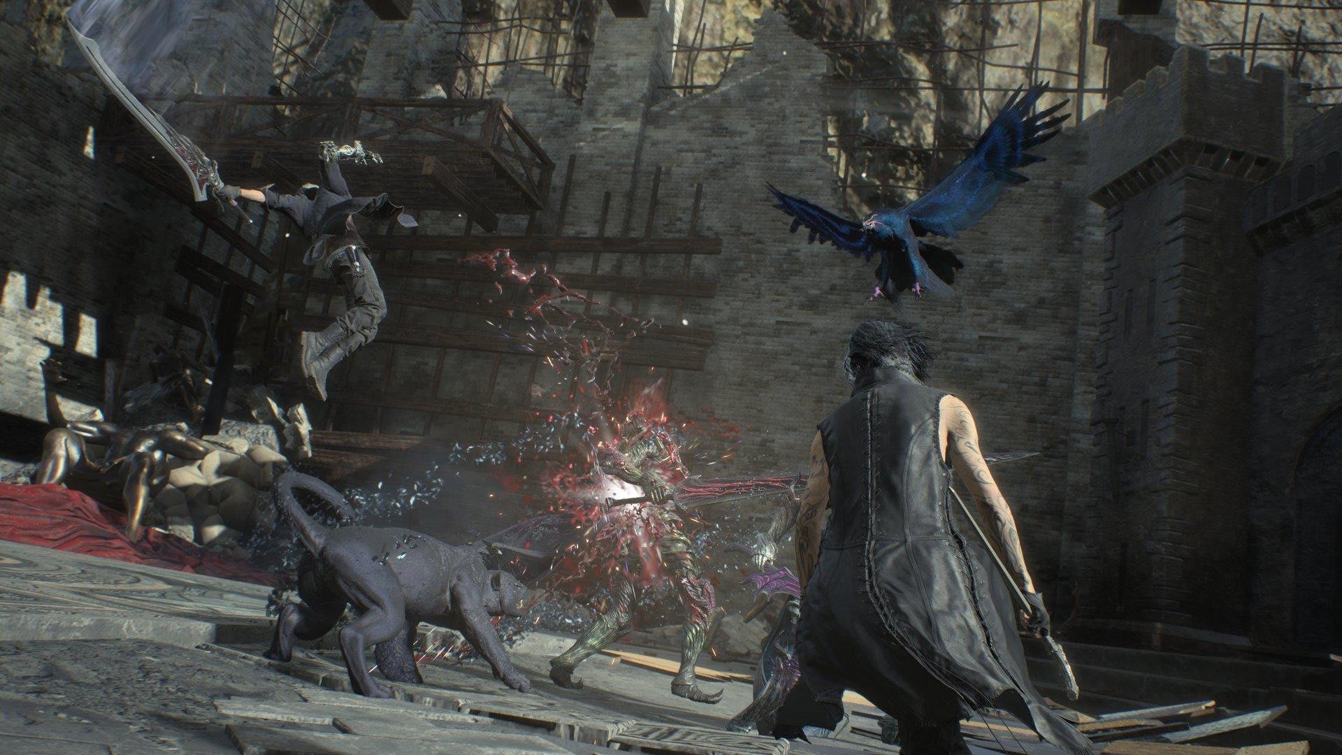 Depois, temos a experiência entregue por personagem, o que é um universo por si só. Nero conta com diversos comandos já conhecidos de outros games e sua nova arma, o braço mecânico Devil Breaker, traz inúmeras opções de combate, onde cada um deles tem golpes e efeitos completamente diferentes. Enquanto isso, V conta com uma experiência completamente diferente do que estamos acostumados. Devido a seu estado debilitado (que você entenderá o porquê ao jogar), V deve manter distância dos inimigos e conta com três demônios que ele consegue invocar para batalhar: um corvo, uma sombra (em forma de pantera) e um pesadelo (uma gigante e monstruosa criatura). E o que dizer de Dante? O mais clássico protagonista da série retorna com sua clássica espada Rebellion, além das pistolas Ebony e Ivory. Além disso, Dante também terá outras interessantes armas e equipamentos disponíveis no desenrolar da trama e tudo isso só o torna ainda mais poderoso.