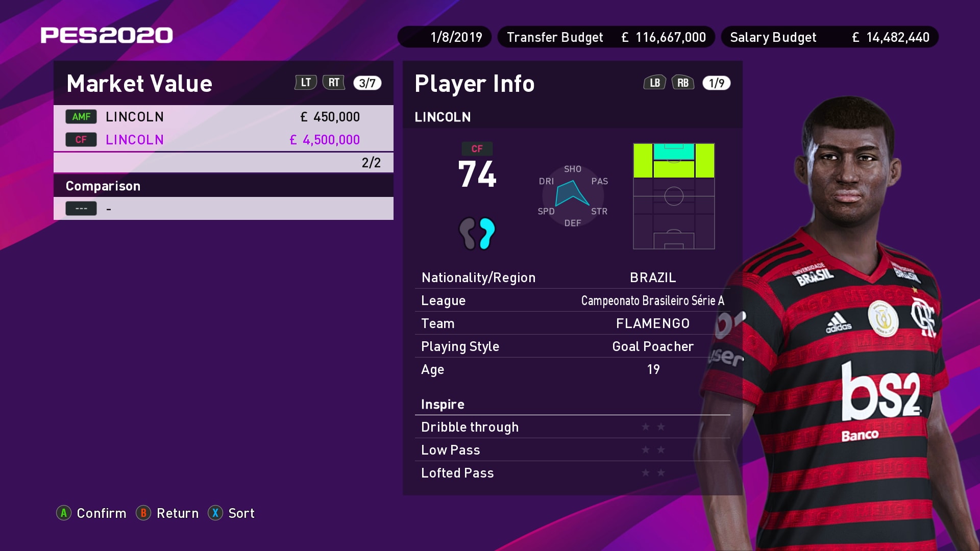 O atacante rubro-negro deveria ser um dos primeiros atletas do seu time, independentemente de onde você é e pra que time torce. Forte, rápido, hábil: Lincoln é tudo o que seus rivais vão odiar em você. Com um total de 74, o jovem de 19 anos tem a capacidade de se tornar um craque no time certo. Além disso, como Davies, tem o papel de Jogador Estrela, então seu clube também ganhará um pouco de dinheiro. Contratá-lo é quase obrigatório.
