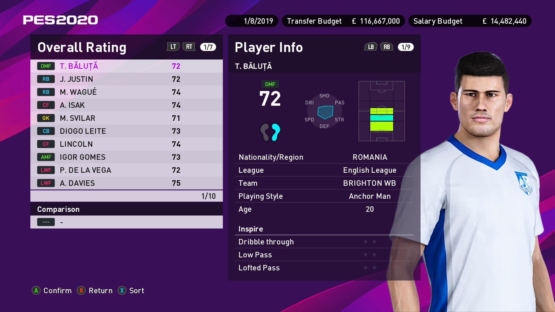 As coisas não estão indo bem para o formando da Academia de Futebol Gheorghe Hagi, então coloque este volante romeno à frente da sua zaga. Tudor Baluta é um jogador forte e capaz de fazer ataques aéreos com sua cabeçada (81), porém também é sólido com a bola nos pés, como mostram o passe rasteiro (77) e a condução firme (75). Esse rapaz não é apenas um meia qualquer e pode ser facilmente a ponte entre defesa e ataque.