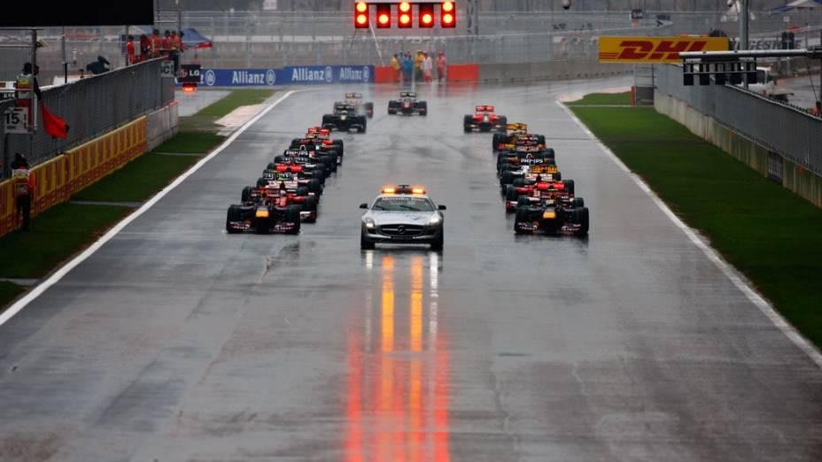 Chovia pra caramba e a largada foi feita com o carro de segurança à frente do pelotão. Hamilton, que largou na pole, ameaçou ultrapassá-lo alegando que o safety car estava muito lento, prejudicando o aquecimento dos pneus.