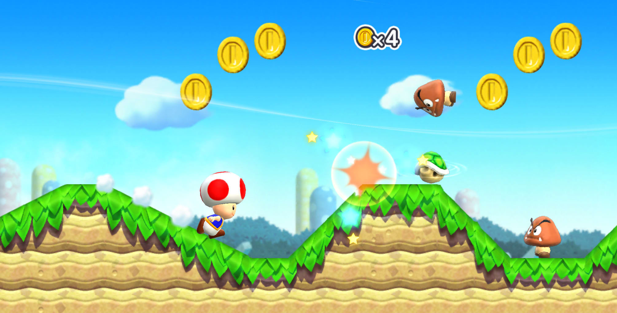 Você pode jogar enquanto come se quiser, porque Super Mario Run só precisa de uma de suas mãos para funcionar - pra falar a verdade, só precisa de um dedo. Todos os movimentos do Mario, até mesmo os mais complicados e acrobáticos, são apenas uma combinação de toques, e apesar de que você provavelmente não vai conseguir ir muito além do pulo básico no começo, alguns mini-games de treinamento como o Rally do Toad, uma fase de plataforma com tempo limitado que exige total maestria dos movimentos do Mario. E quando você vence, você ganha Toads! Por que eles são importantes? Bom…