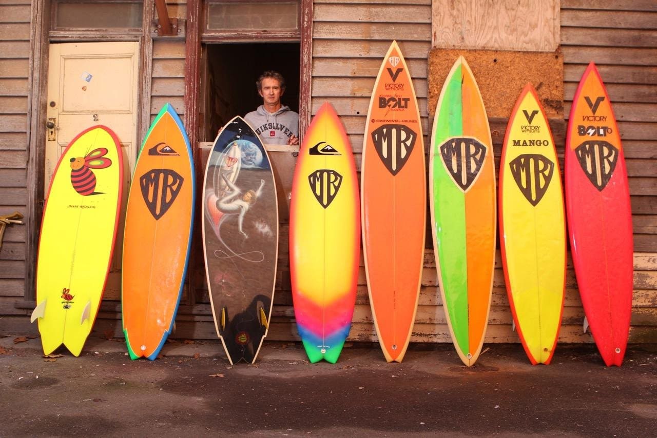 Olha, talvez você precise procurar muito na internet ou em revistas de surfe uma foto de Mark Richards surfando com uma prancha branca. Ele não tem um design muito específico ao longo da carreira, mas o logo com as iniciais do seu nome, MR 'a la Superman' está sempre presente. As cores fortes também são a grande característica das pranchas do australiano. Quase sempre da mesma forma, elas têm uma cor sólida, com as bordas de outra cor e o símbolo 'MR' grande no meio. Muito característico e design que ele mantém até os dias de hoje.