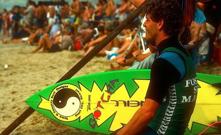 Nos anos 80 as cores 'cheguei' estavam na moda! Essa prancha verde amarela de Martin Potter ficou mundialmente conhecida depois que ele saiu na capa da revista Surfing, em julho de 1984, com ela mandando uma aéreo bizarro para a época. Aquele era o primeiro aéreo já completado a sair na capa de uma revista. Por anos e anos este design foi copiado e é, até hoje, icônico e moderno!
