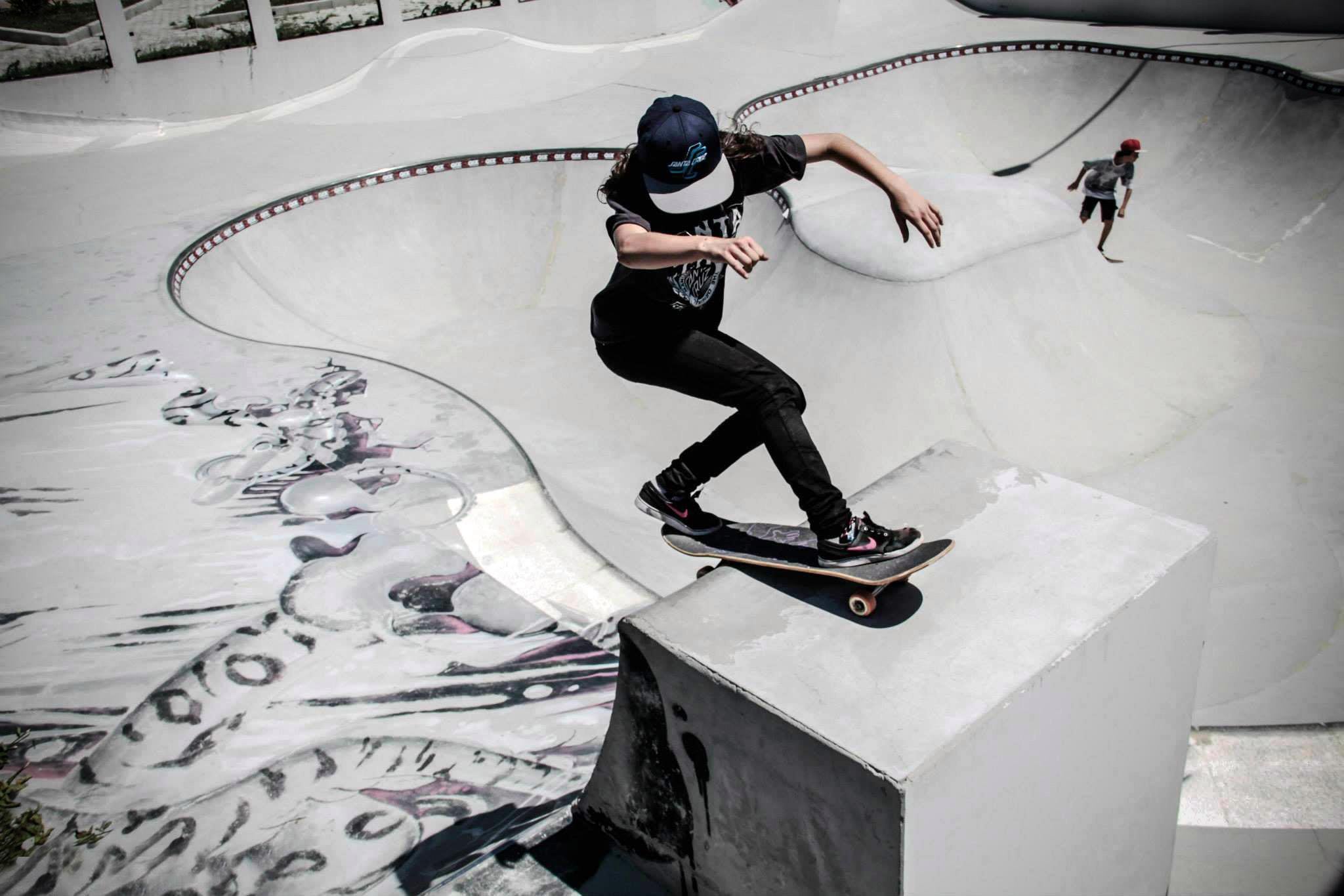 ...a primeira mulher a voltar o Frontside Smithgrind no fundo da Kako’s Pool.