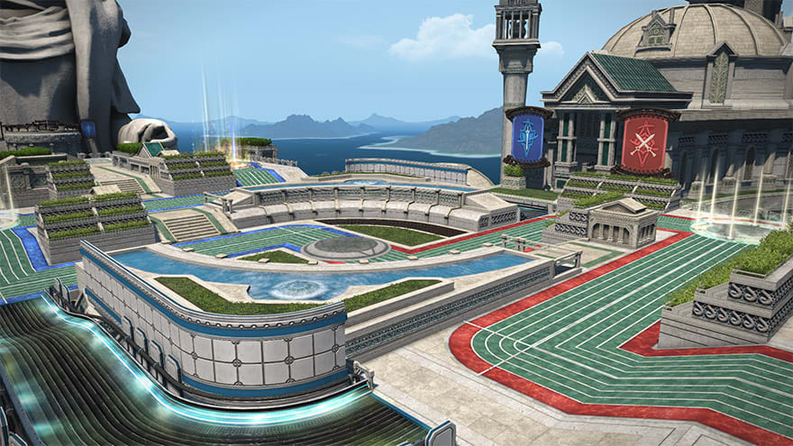 The Palaistra is a simple olympic style arena with sprint zones extending far along the sides of the map. The Palaistra lends itself to all of the classes due to its wide expanse and lack of barriers allowing for all types of play whether you prefer long range or close quarters melee. Confrontation is necessary and immediate as there are no walls or tight corners between the opposing teams and the crystal, which is housed right smack in the middle of a wide open space. Along with its Sprint Zones, it allows for a mosh-pit style of combat where all players eventually and can quickly coalesce onto the crystal no matter how far either side it is.