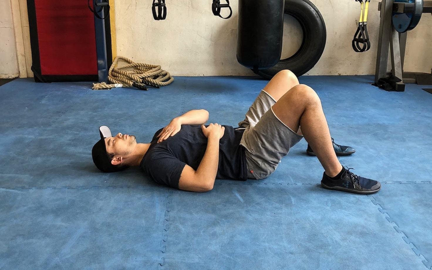 To wrap your head around correct diaphragmatic breathing its best to lie flat on your back with your knees bent, and place one hand on your belly and one hand on your chest.