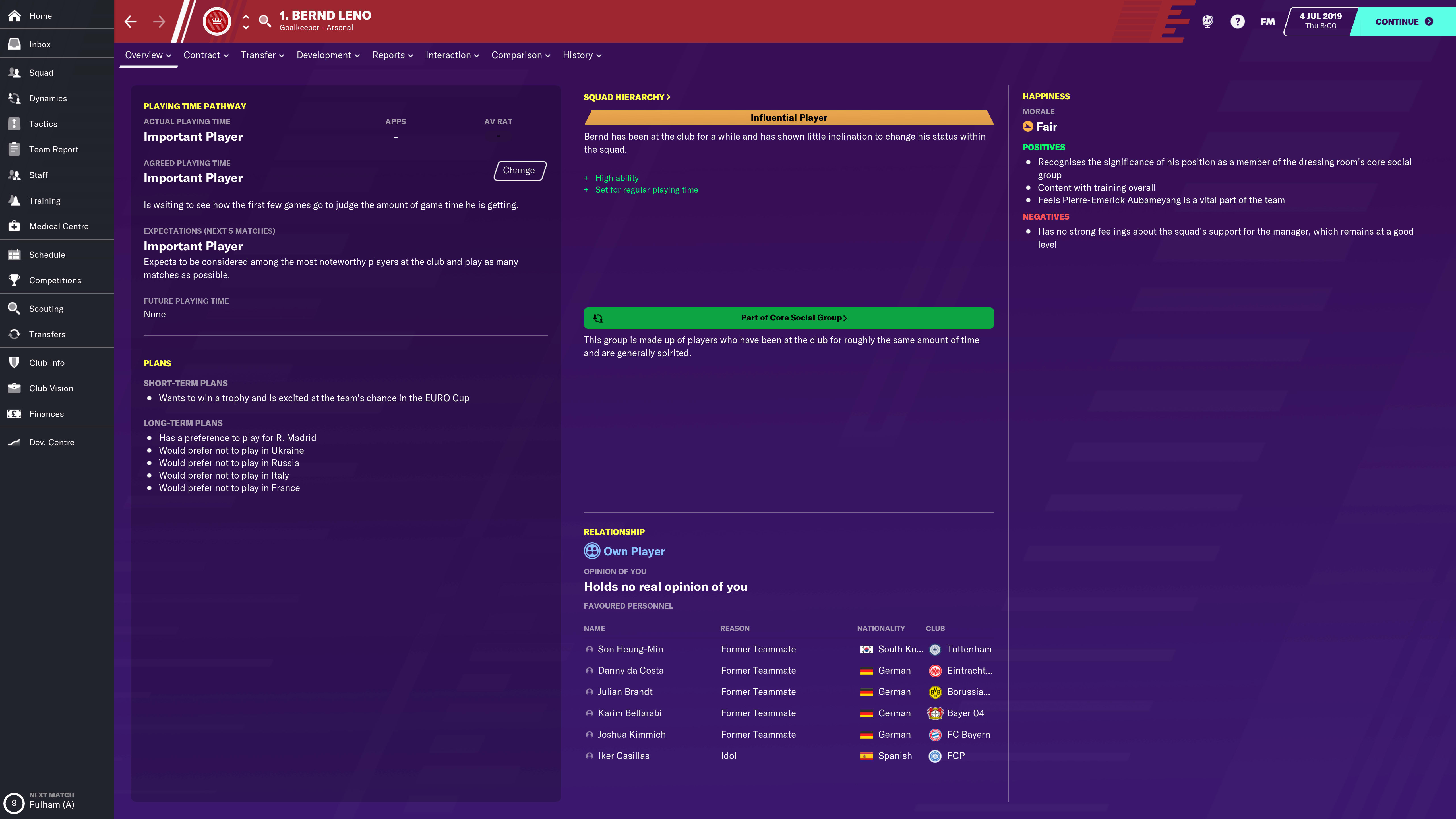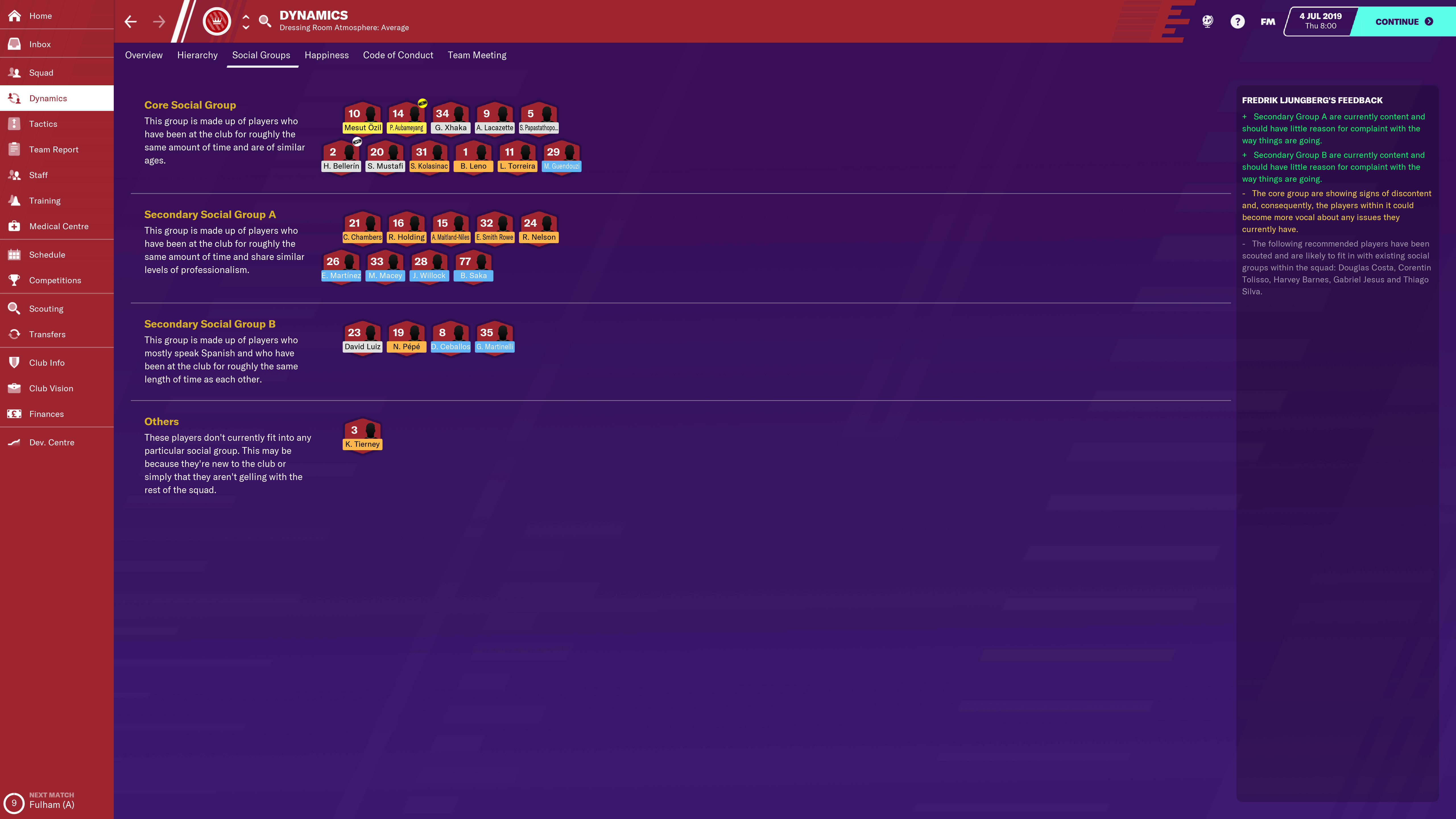 The dynamics screen is, as you’d expect, where you’ll find a lot of your information - particularly the Hierarchy screen. Not only does it give you a very basic temperature check on the dressing room atmosphere at the top of the screen, but it’ll give you staff advice on points of contention amongst the players.