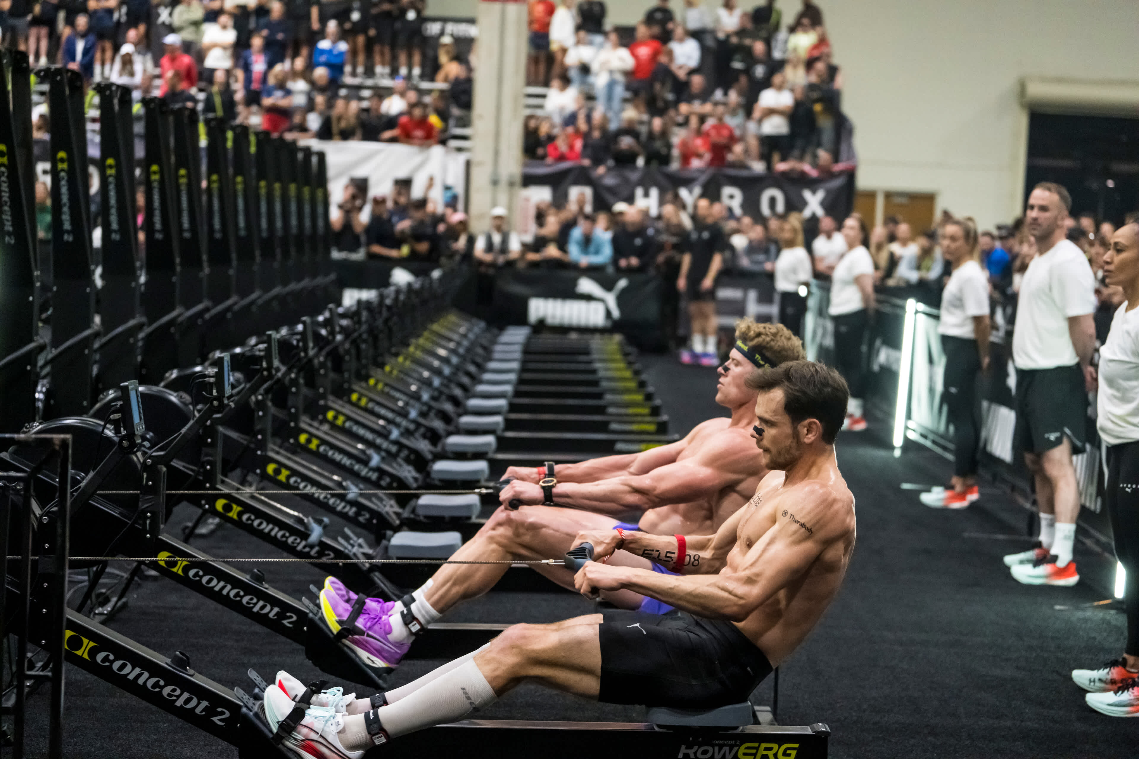 Tim Wenisch and Hunter McIntyre compete fiercely on rowing machines during the Men’s Elite 15 at Hyrox Chicago, USA.