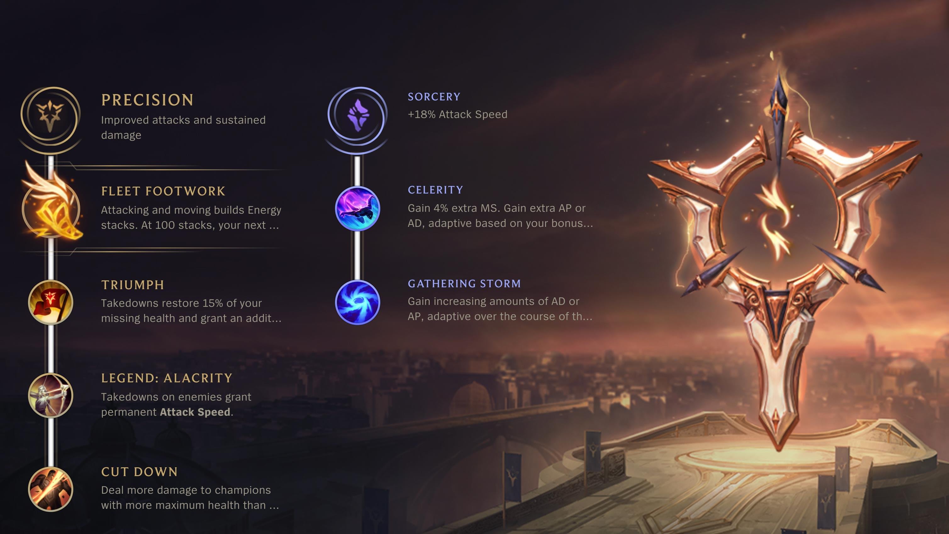The first is a standard AD Carry rune page, focusing on Fleet Footwork and revolving around Kai’Sa’s auto attacks. Alacrity is essentially a free attack speed buff for Kai’Sa doing what she does best, while Celerity makes her an extremely mobile AD Carry.