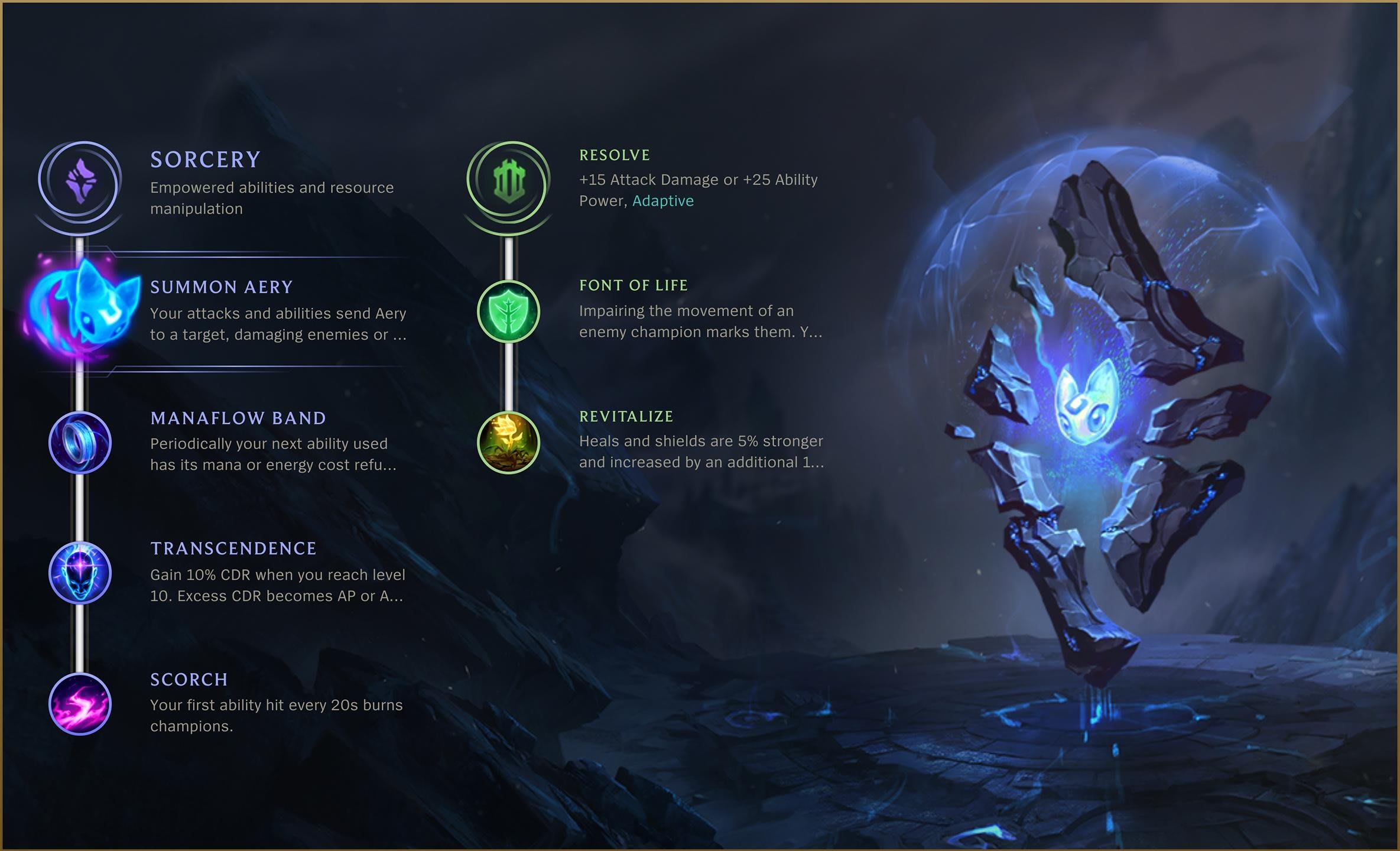 There are multiple rune pages that would work well with Yuumi. This is just one of many alternatives. Summon Aery will allow you to deal more damage with your Q ability, particularly in the laning phase. Manaflow Band will give you that extra important mana that’s important for your sustain. Transcendence allows you to dish out more spells. And Scorch increases your poke damage.