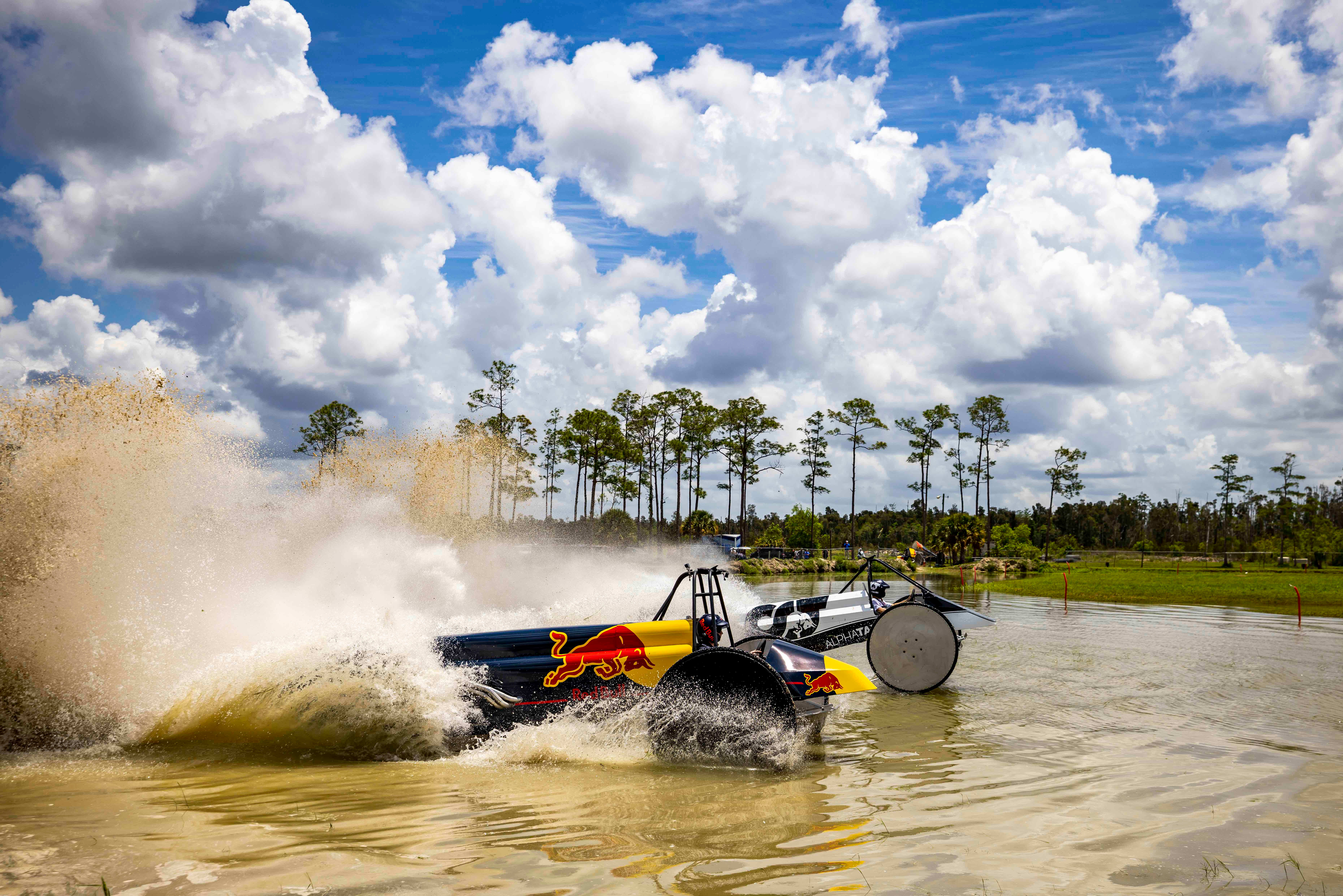Two hours west of Miami lies the city of Naples, surrounded by the Florida Everglades and, since 1949, home to the tradition of swamp buggy racing. These 900bhp V8 buggies with 68in (172cm) wheels draw large crowds to witness head-to-head racing around a track submerged in standing water. Travelling to the far side of the Florida peninsula, Verstappen and Tsunoda were joined by 250 East Supercross Champion Jett Lawrence and skateboarding icon Zion Wright for a true Floridian experience and showdown in the swamp.