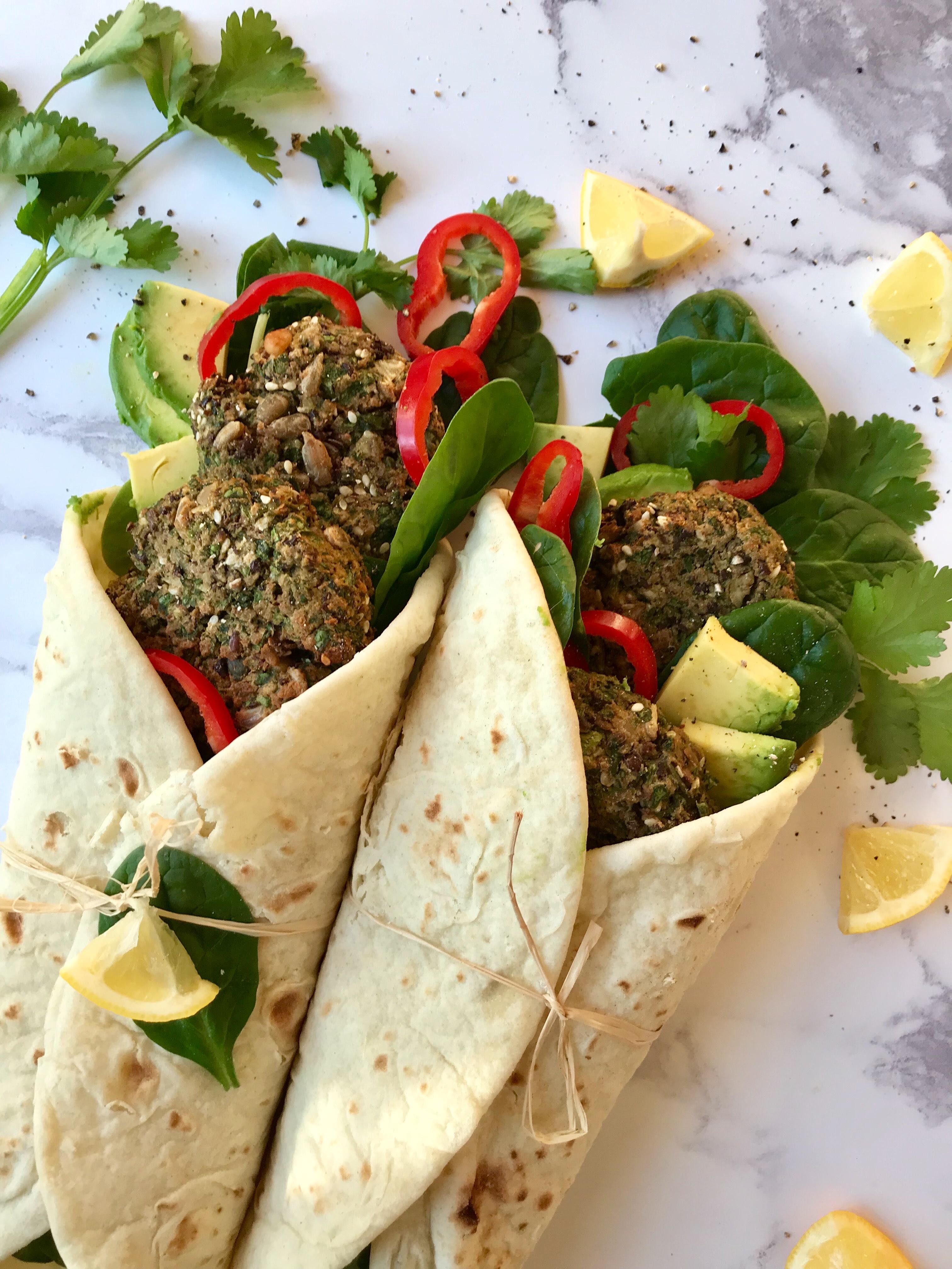 4. Wrap two burgers in each flatbread with baby spinach, red peppers, avocado slices and fresh coriander, and a little tzatziki or mayo.
