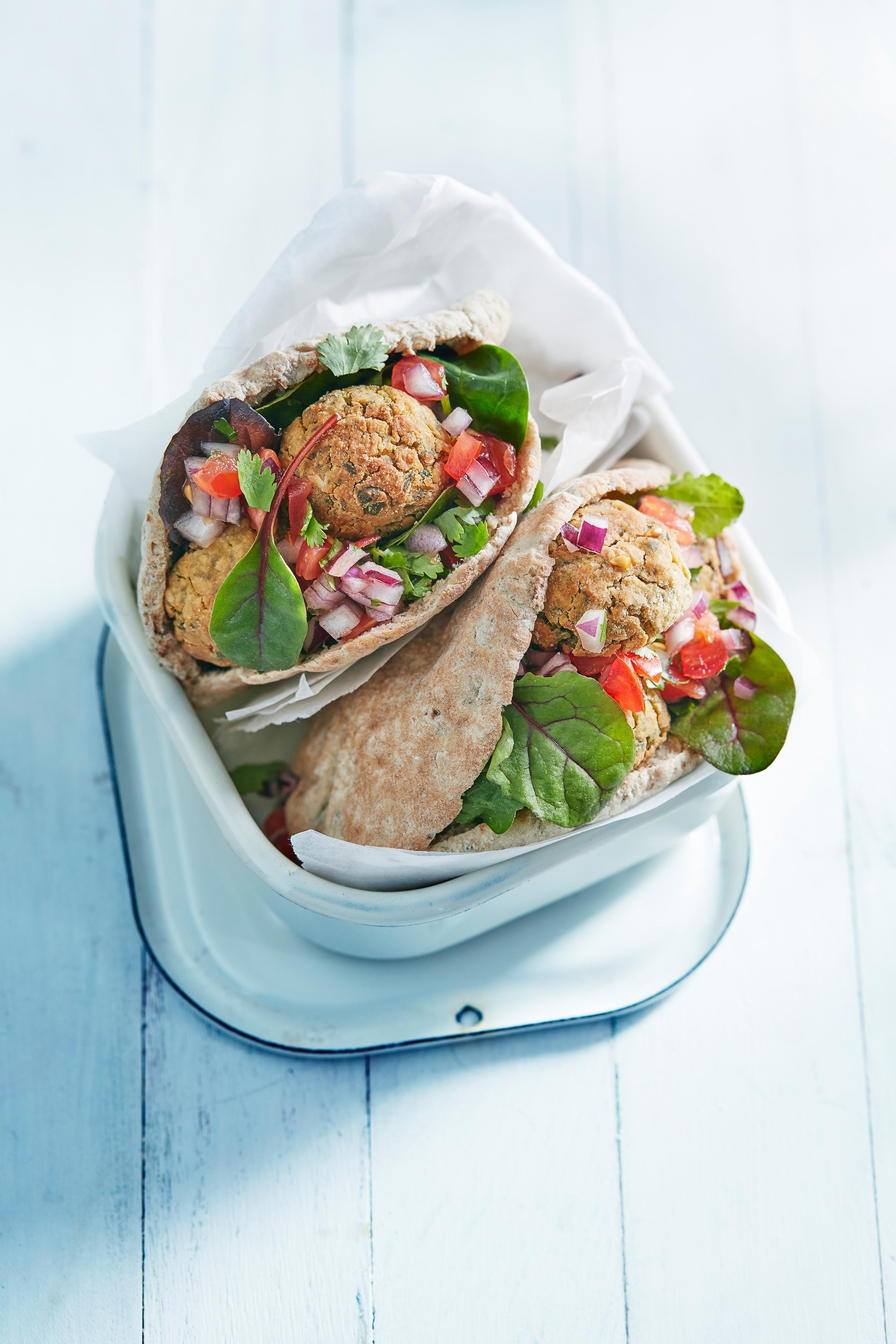 5. Serve the cooked falafel with tomato salsa, salad and wholewheat pitta breads