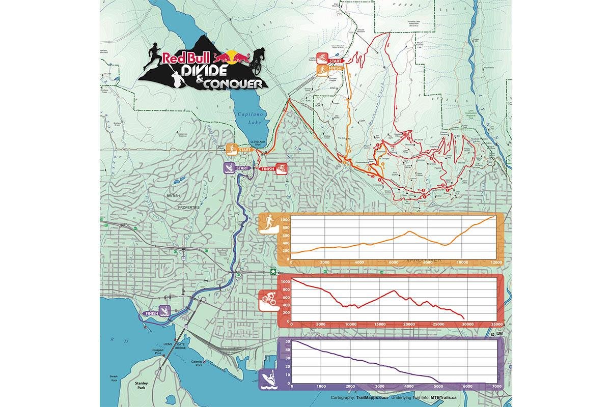 The mountain bike section of Red Bull Divide & Conquer will be challenging both physically and technically - so riders will have to sharpen their skills and bring a good set of lungs. The course will start with a five-kilometer section of fireroad beginning at the top of Grouse with a slight downhill grade on a gravel road allowing for closely bunched groups to work together or separate themselves with a little effort from those chasing.