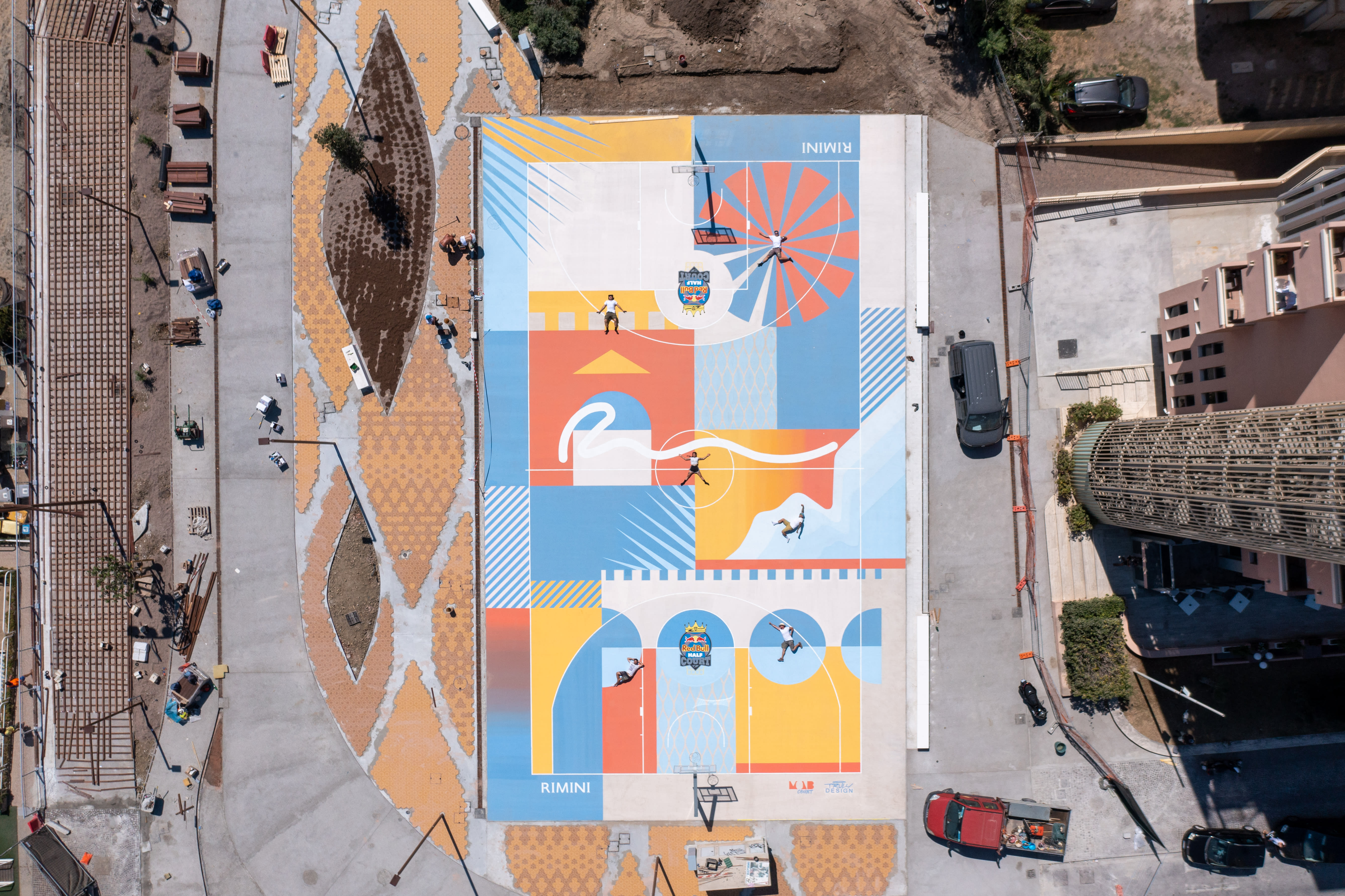 And there’s a seaside vibe at Rimini’s beach court, which features artwork by Emanuele ‘Rems182’ Ronco and Mauro ‘Mauro149’ Italiano with their Truly Design crew and is located at the city’s Piazzale Kennedy, a famous waterfront promenade. Like many of the renovated playgrounds globally, these Italian courts were upgraded for high performance with products from Mapei, the Official Supplier of the Red Bull Half Court World Final 2022.