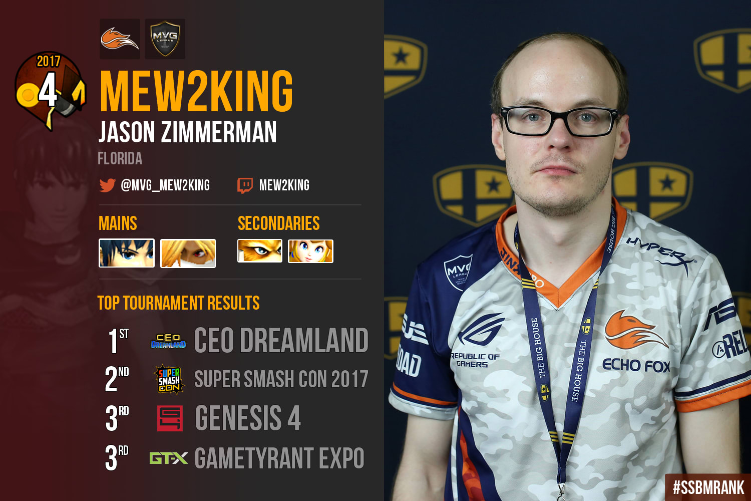 Jason “Mew2King” Zimmerman started 2017 off in a rather strong fashion, with third, fourth and second place finishes at Genesis 4, Smash Summit Spring 2017, and Frame Perfect Series 2, respectively. Within these first few months, he earned significant wins against ChuDat, Wizzrobe, SFAT, Axe, Plup and Hungrybox, all while only dropping sets to fellow members of the Top 6. Mew2King’s first big hit of the year came at Smash Rivalries, where upset losses to Wizzrobe and Axe resulted in an unexpected ninth place finish. However, this placing would prove to be a bit of an anomaly, as Mew2King would only place outside of the Top 8 on one other occasion all year.