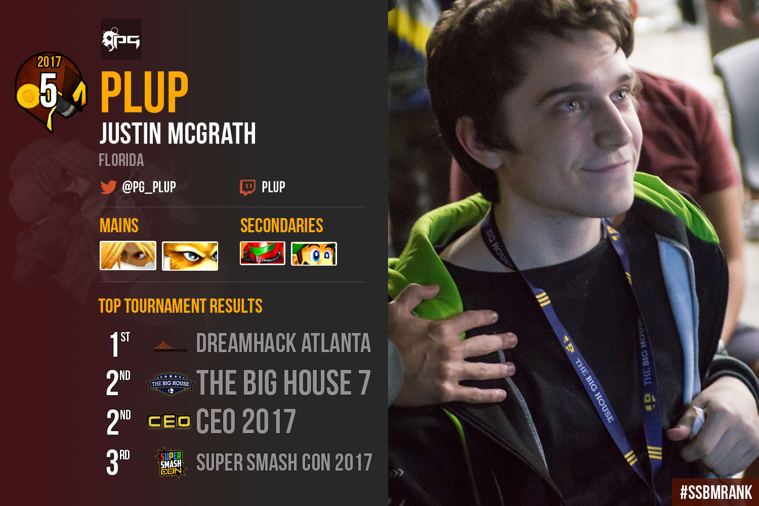 It's hard to talk about Justin "Plup" McGrath without gushing about his play. Described by Mang0 as “the ideal blend between offense and defense,” Plup is a generational talent with seemingly infinite matchup knowledge, tactical decision-making and blinding speed which combined make him a formidable opponent both in Melee and in Minesweeper. Here's a fun fact: Plup has beaten a fellow "Big Six" member and Godslayer Leffen with three characters in tournament, Sheik, Samus, and Fox. That's not a knock on the legendary Swede as much as it's testament to Plup's playing ability transcending character choice. You could just as easily look at Plup's impressive fifth place at CEO Dreamland defeating top players such as Nintendude, DruggedFox and a game off of Mew2King’s Sheik, all with Luigi as evidence of perhaps the strongest understanding of neutral over multiple characters. However, Plup’s first place finish at Dreamhack Atlanta, defeating Axe, Mew2King and Hungrybox both in Winner’s Finals and Grand Finals exhibited his prowess at taking out some of the game’s best with deadly accuracy.