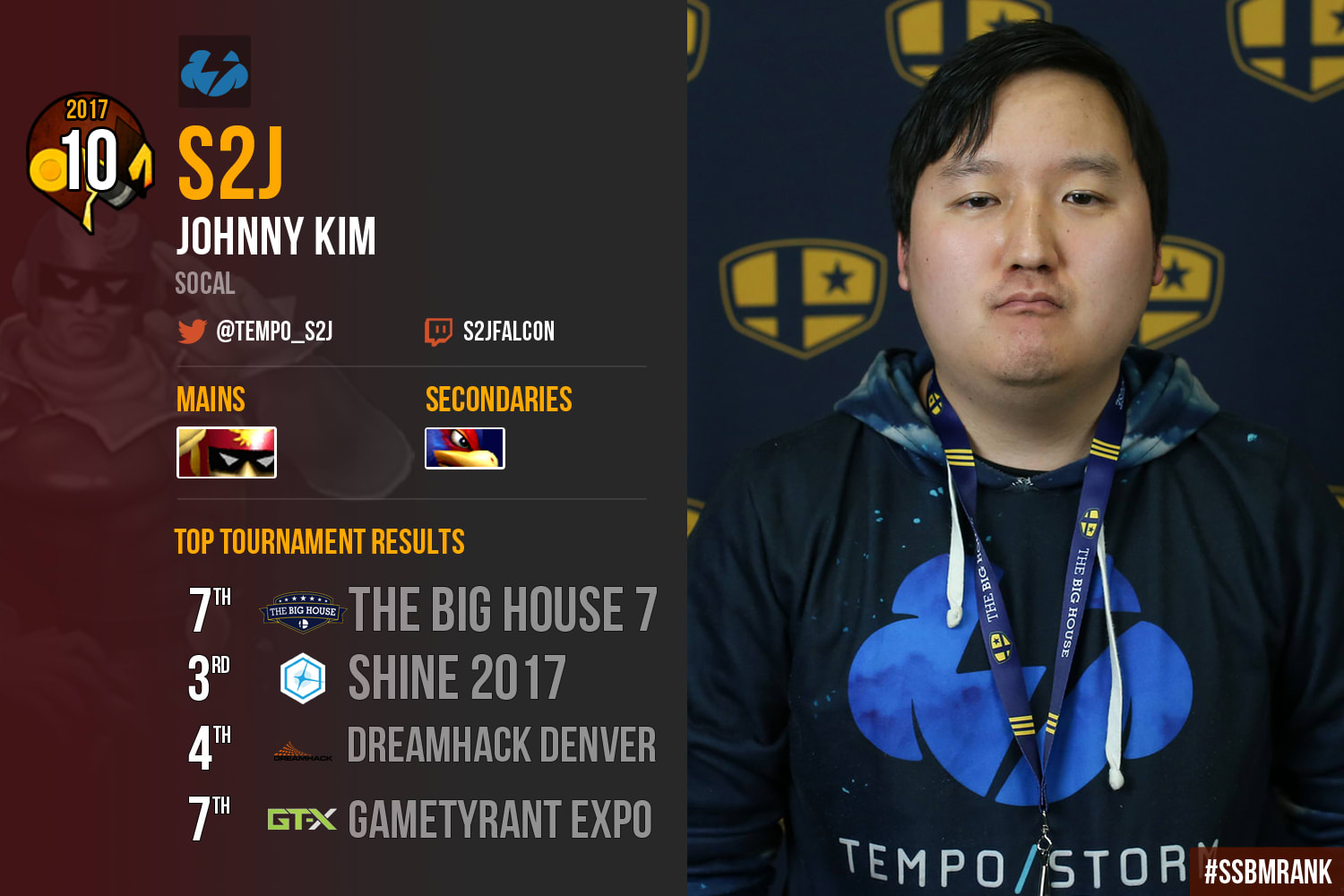2017 looked to be the breakout year for premier Captain Falcon main Johnny “S2J” Kim. After years of placing solidly, but not consistently stellar, the player finally faced some of his greatest demons this year head on. This SoCal legend has been a fan favorite for years with his flashy combos and his ability to clutch it out in last stock situations with devastating 0-to-deaths (universally referred to as "Johnny Stocks").