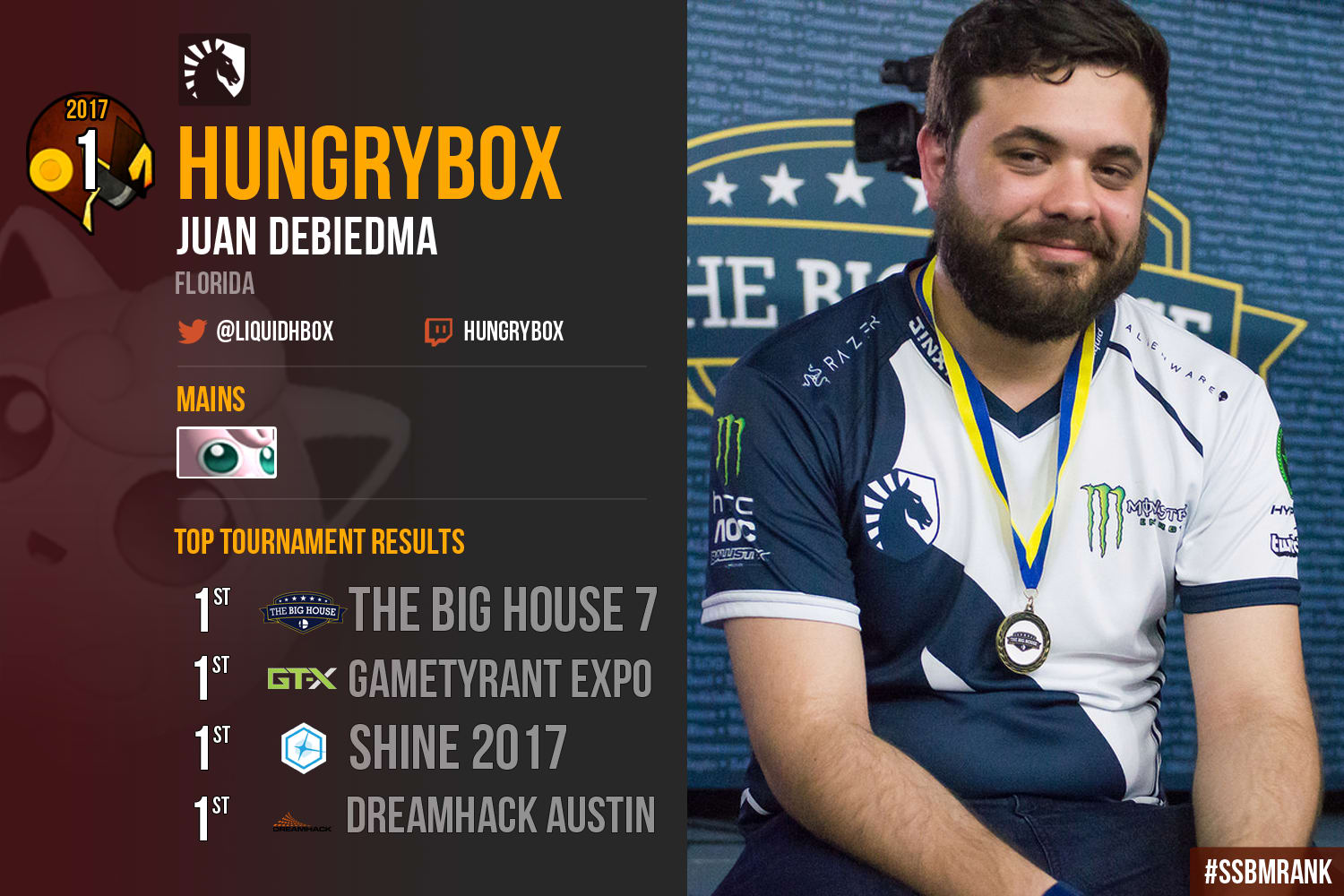 2017 has undoubtedly been the best year in Juan “Hungrybox” Debeidma’s decade long competitive Smash career. When the Summer 2017 edition of SSBMRank was released with Armada at the top, it was hard to envision a year ending with Hungrybox surpassing him in the rankings. Previously the perennial second place, Hungrybox has managed to overcome his past demons and claw his way to the top of the Melee competitive scene. Boasting a winning head-to-head record against every single player other than Leffen for the year (with whom he is even in sets), it is clear that Hungrybox deserves his ranking at the top of the Melee scene.