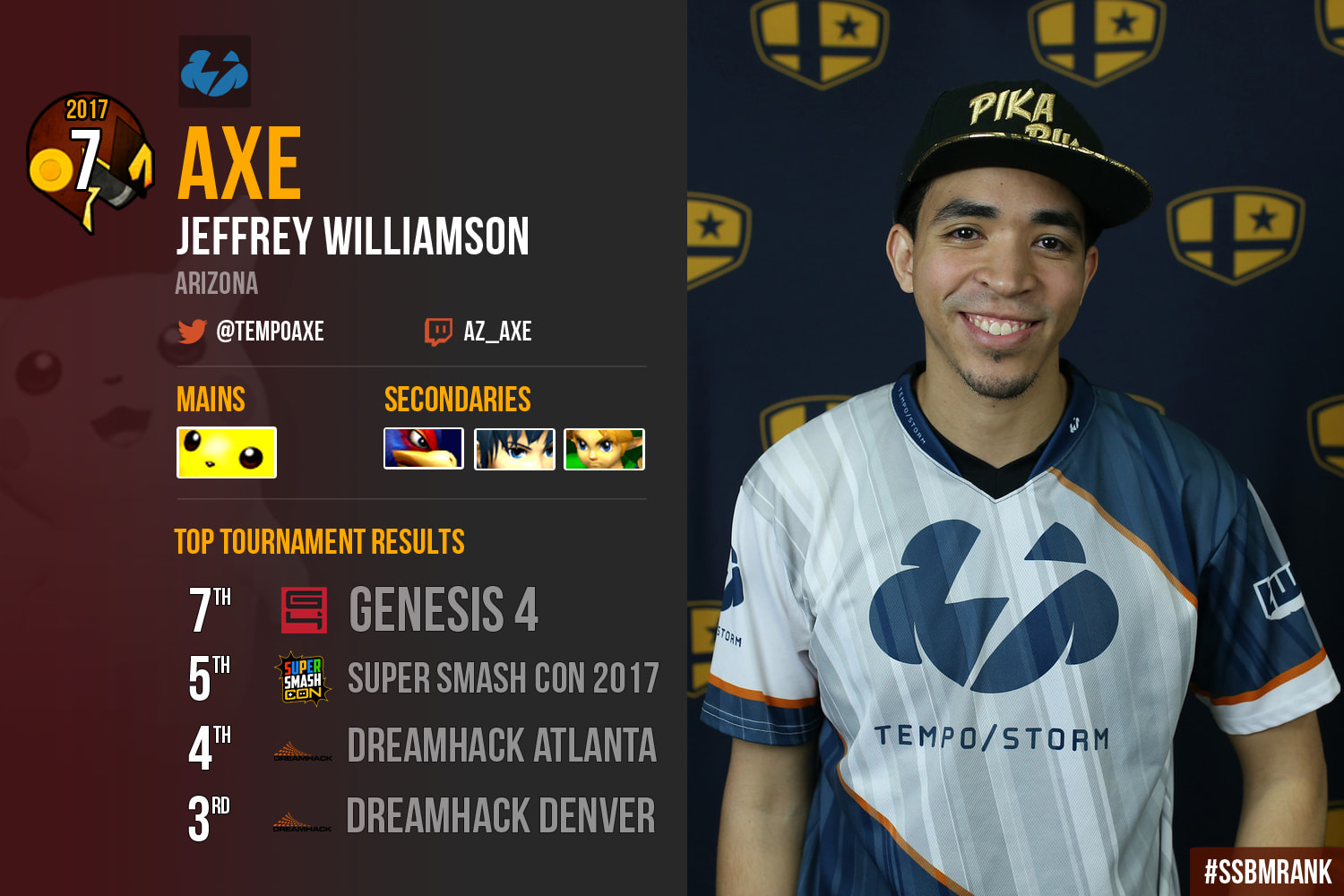 Few players can control a crowd the way that Tempo Storm's Jeffrey “Axe” Williamson does. Whether it is because he has pushed his character to the limits of the current meta-game, or because he carries the state of Arizona on his shoulders — literally, in the form of a flag — Axe charges up the audience whenever he hops on the big stage. However, Axe’s popularity does not come merely from his status as the only Pikachu main in the Top 100; Axe is an incredibly skilled player, with tricky movement options, impeccable edgeguards and a creative punish game, all of which have the power to get an audience up on its feet.