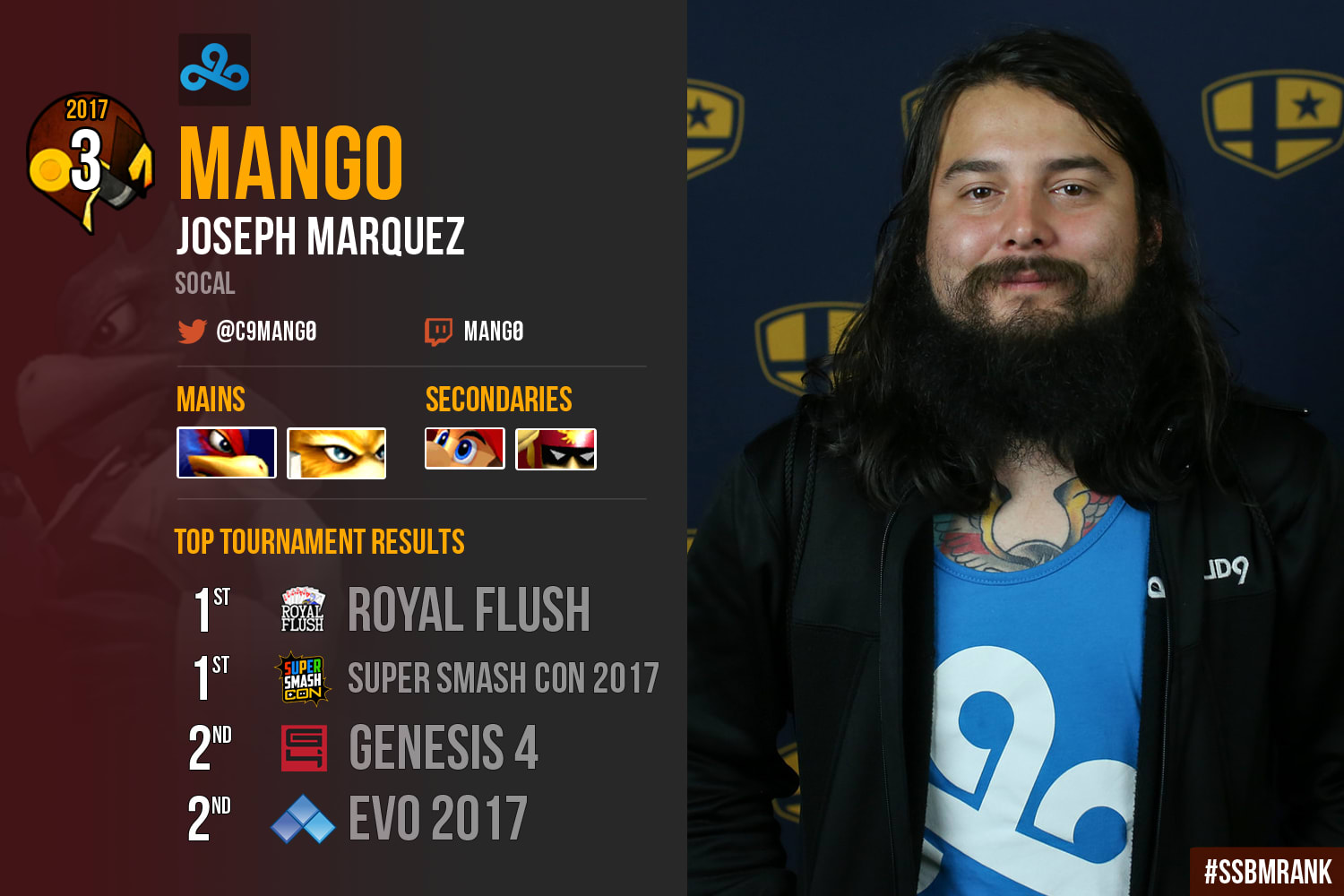 Fans of Joseph "Mang0" Marquez know that rooting for the Cloud9 pro often comes with a frenzied ride of emotions, both good and bad, a pattern which held up throughout 2017. Despite starting off the year with a strong second place finish at Genesis 4, with wins against Wizzrobe, Hungrybox, Leffen and Mew2King, Mang0 struggled to maintain higher placings through the first quarter. At best, Mang0 achieved respectable placings, such as fourth and seventh at DreamHack Austin 2017 and Smash Rivalries, respectively; at worst, Mang0 failed to even make Top 8, placing ninth at Smash Summit Spring 2017 (his worst result in the series), and even 13th at Frame Perfect Series 2 (though he did play exclusively Captain Falcon at this event). It was also around this period of time that lower level opponents began getting the better of him, like Plup, Axe and ChuDat, all of whom were positive in sets against him at that point.