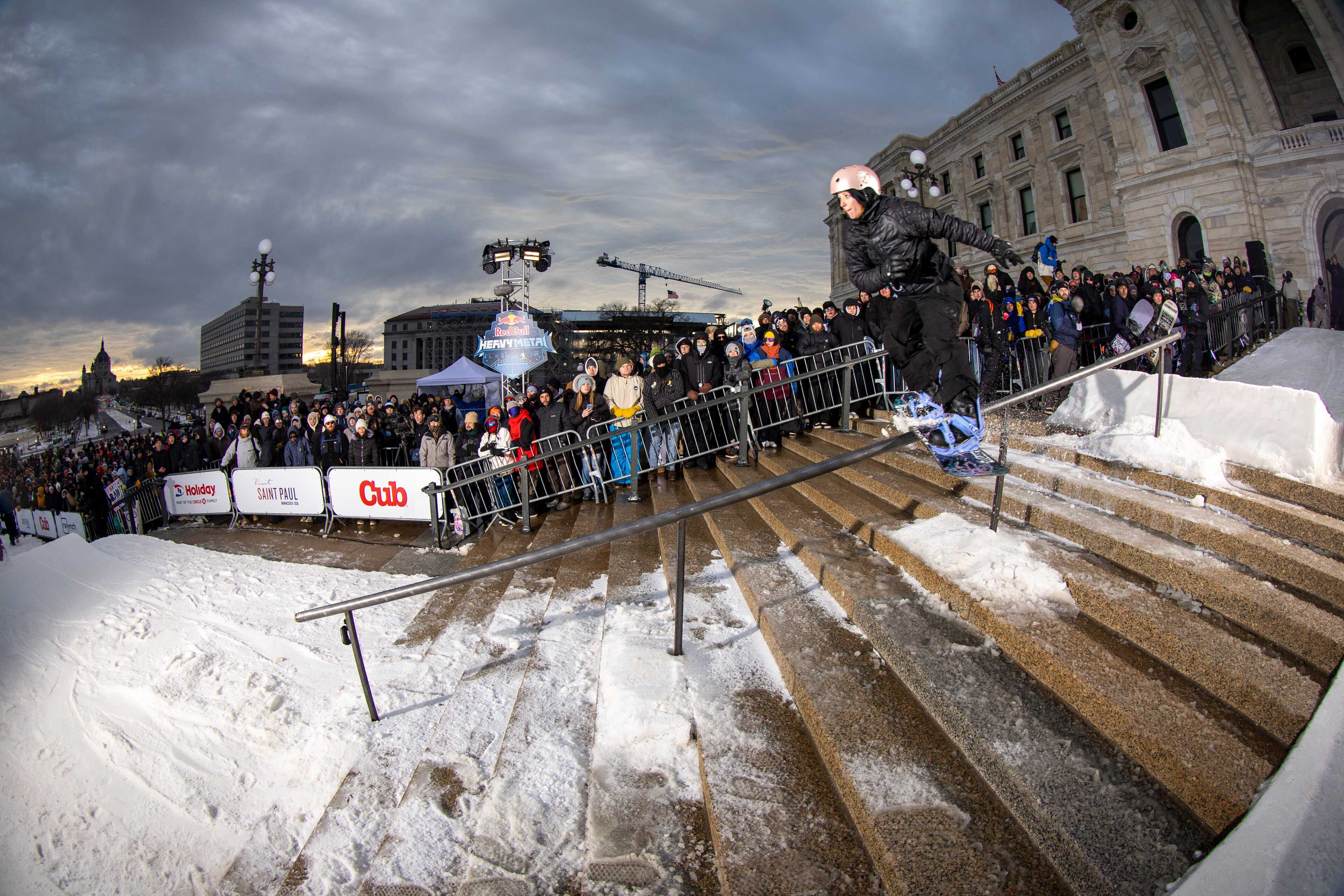 Big, fluffy snowflakes filled the sky as Melvin Carter, the mayor of Saint Paul, stood in front of the State Capitol Building ahead of the 2025 event. Next to him were wide lanes of snow with manicured take-offs leading to rails, ledges, and a hefty light pole gap. Sanctioned space to snowboard on a government building with the blessing of the mayor – who deemed it officially Heavy Metal Day – seems like a fever dream, but it was officially open season for boarding.
