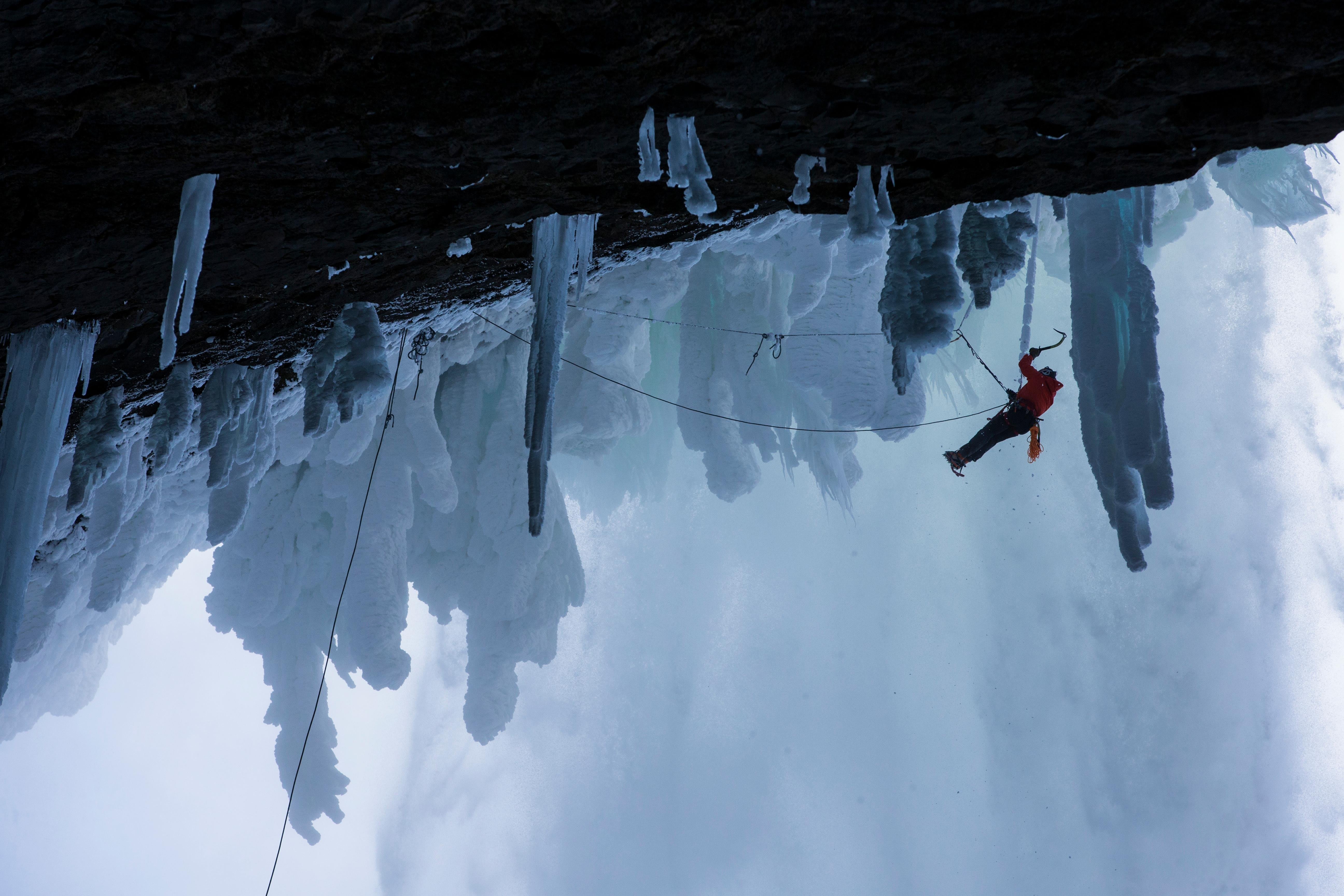 The fourth-highest waterfall in Canada is backdropped by a massive, upside-down amphitheatre of overhanging rock. Spray from the waterfalls hit the wall, covering it in a thick (and sometimes thin) layer of ice. Canadian Will Gadd put up an incredible first ascent on Helmcken Falls in 2014.