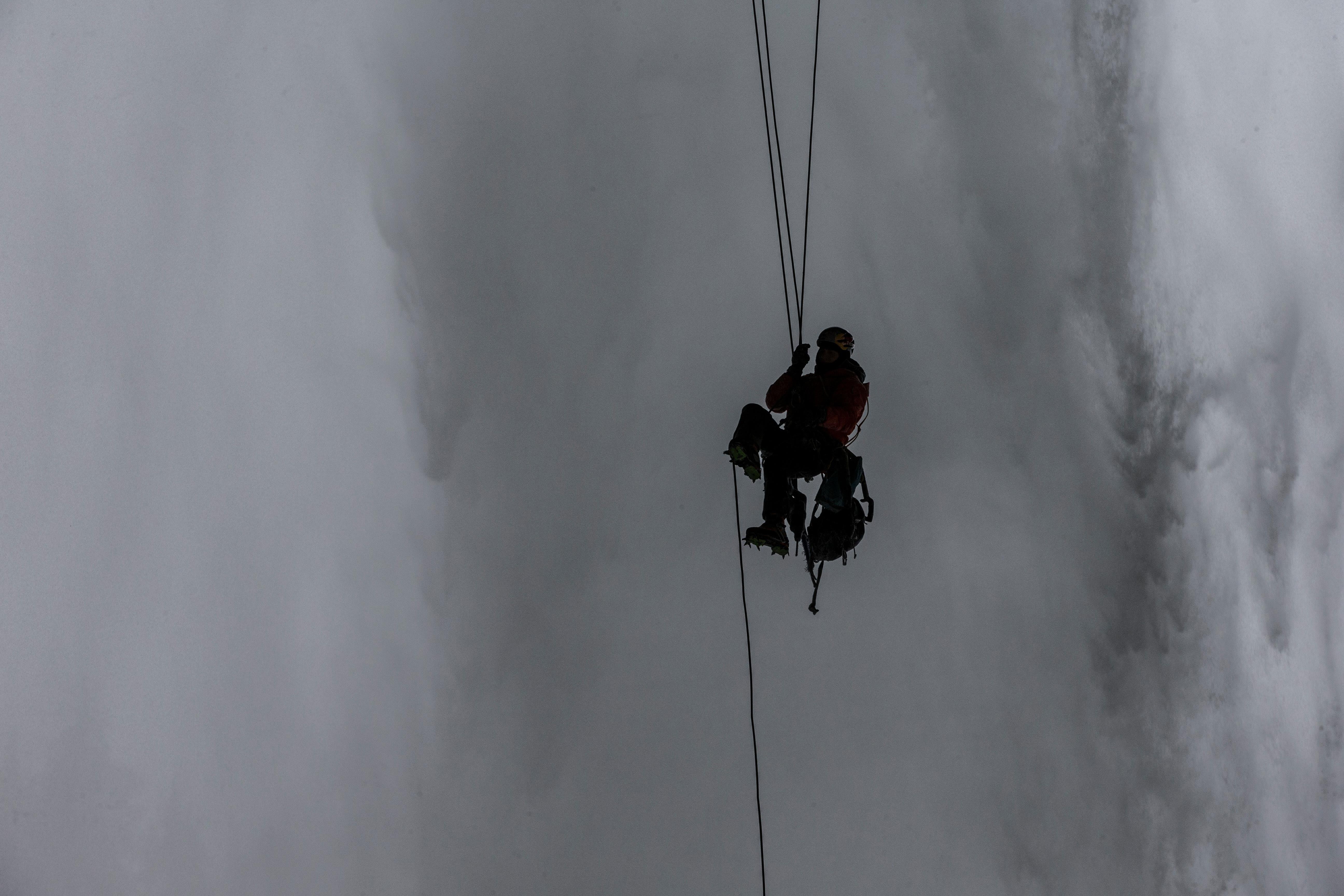 The climb required that Gadd and his team would spend two weeks rigging and bolting the climb, deep in the middle of winter. But before they could do that though, Gadd first had to check it out during the summer. "I wanted to rappel off the edge and see what's down there," he says. "There's a lot of questions about what we were putting our bolts into – you have no idea if the only holding that rock into the wall is a thin layer of ice."