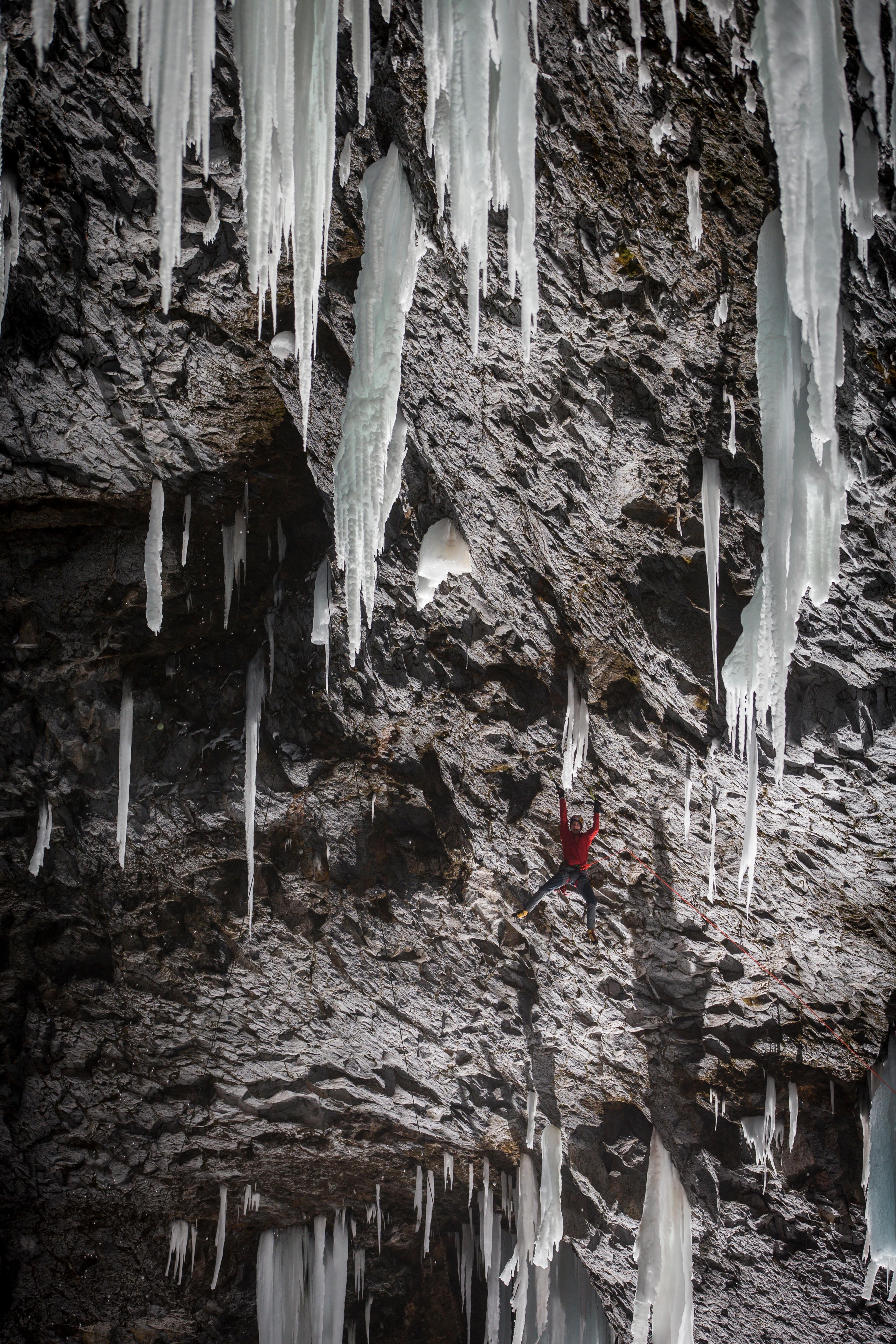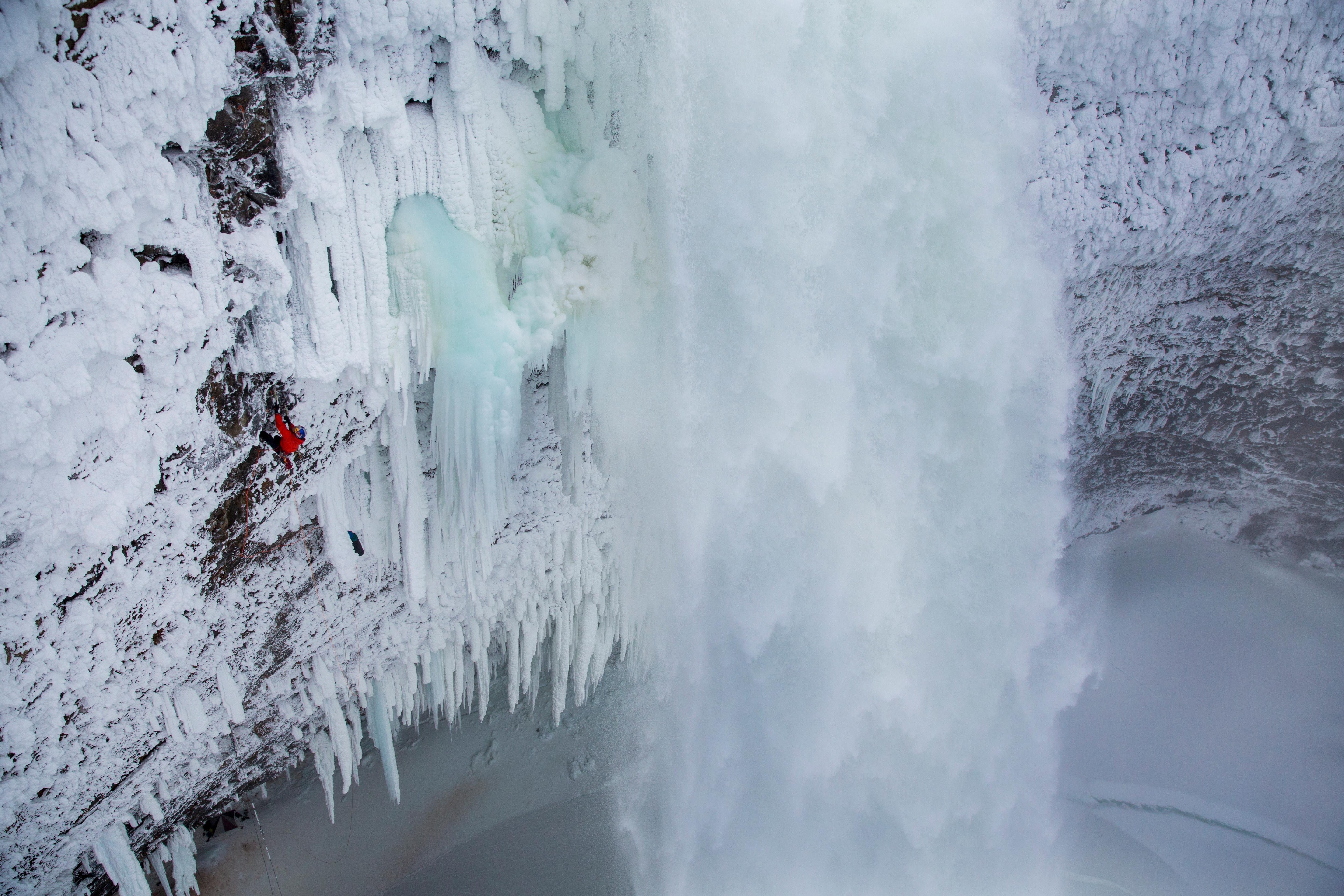 Just getting to the climb is no easy task. Even though it's not far from Clearwater, British Columbia, in Canada, you can't exactly walk there – to get to the bottom, you rappel in from the top.