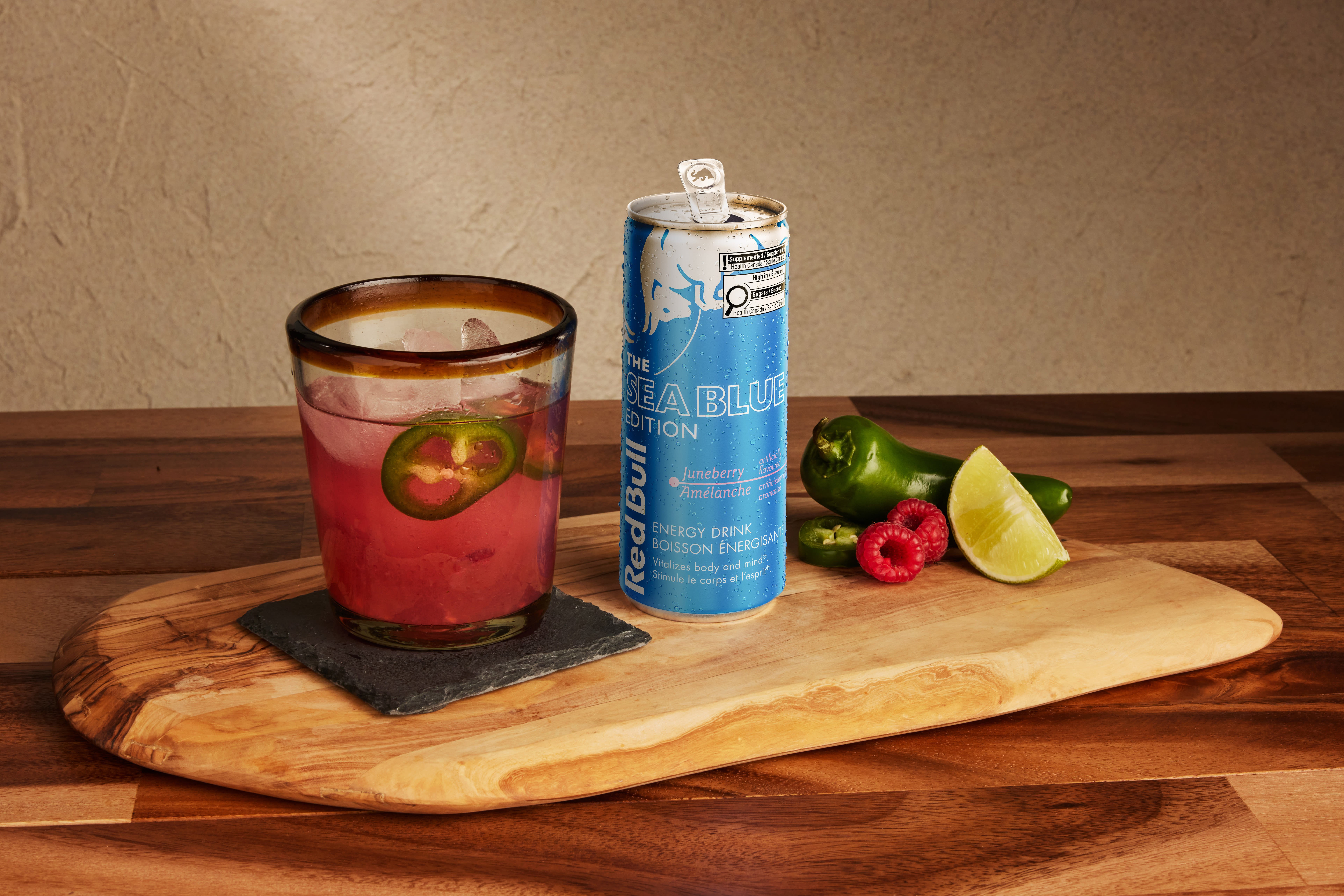 - Quatrième étape : Passer le mélange par un double filtre sur de gros glaçon. Compléter avec une canette de l'édition Sea Blue Red Bull de 250ml. Compléter avec une tranche de jalapeno.