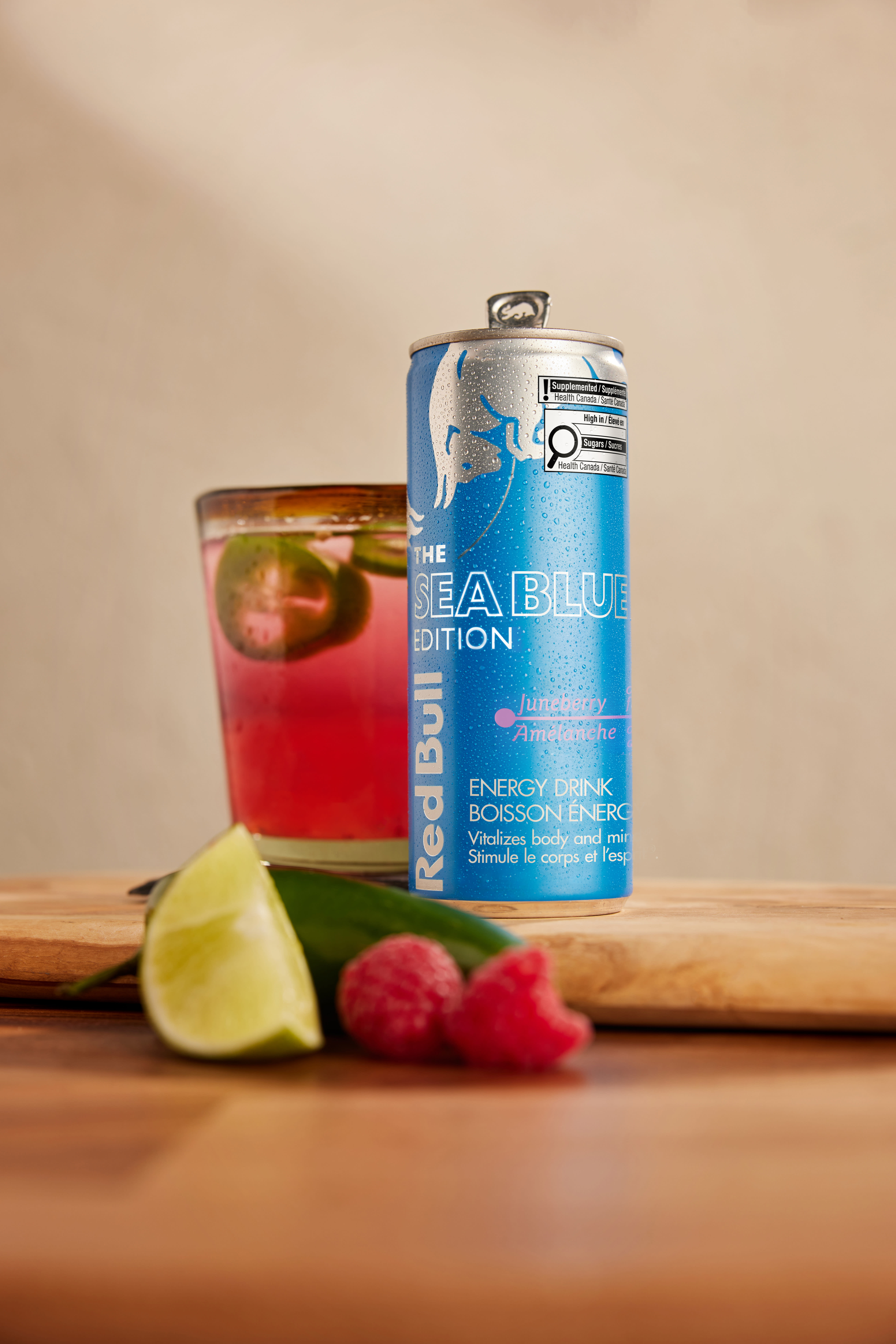 Que vous soyez en route pour une escapade d’été, que vous planifiez une journée à la piscine, au lac, à la plage, ou que vous profitiez d’une soirée sur le toit avec des amis, l'édition Sea Blue Red Bull vous donnera des aiiiles pour n’importes quelle aventure. De plus, avec des notes d’amélanche de raisin rouge, de cerise et de baies rouges, l'édition Sea Blue Red Bull est une excellente base pour un mocktail rafraichissant - voici la recette du mocktail Punch à la Framboise Épicée.