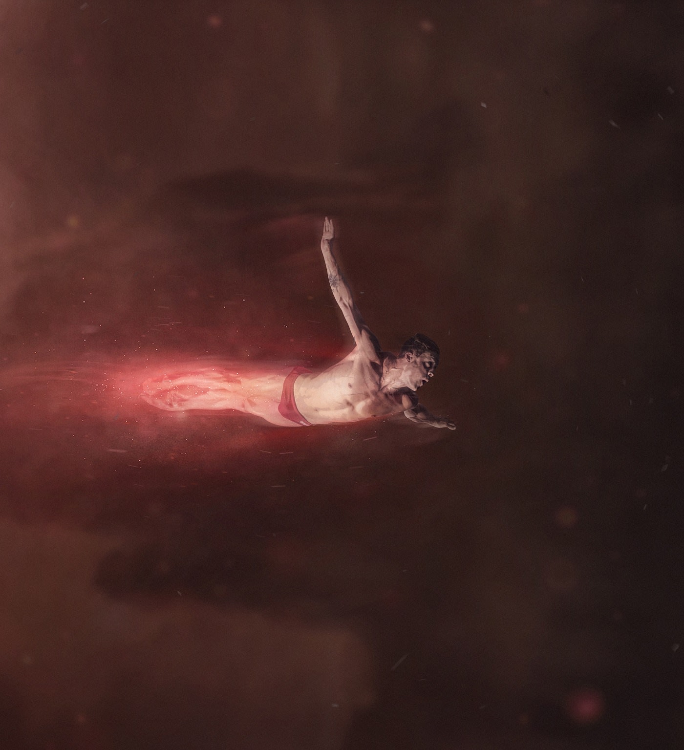 I will describe the process behind an average edit. First, I analyse the original picture, the lights, the mood, the posture... to get an idea what type of edit could work. Then I cut the person from the original background, slightly retouch it and put it on a white background. After that, I browse several stock photos and experiment with different images, styles, themes and techniques. Slowly building layers of images and blending them together is the main part. The last part is the finishing touches like adding particles, filters, colour correcting, retouching, sharpening, blurring and so on. To sum it up, I follow certain steps, but also always experiment with different paths and that's what I love about it, and why my work is so diverse.