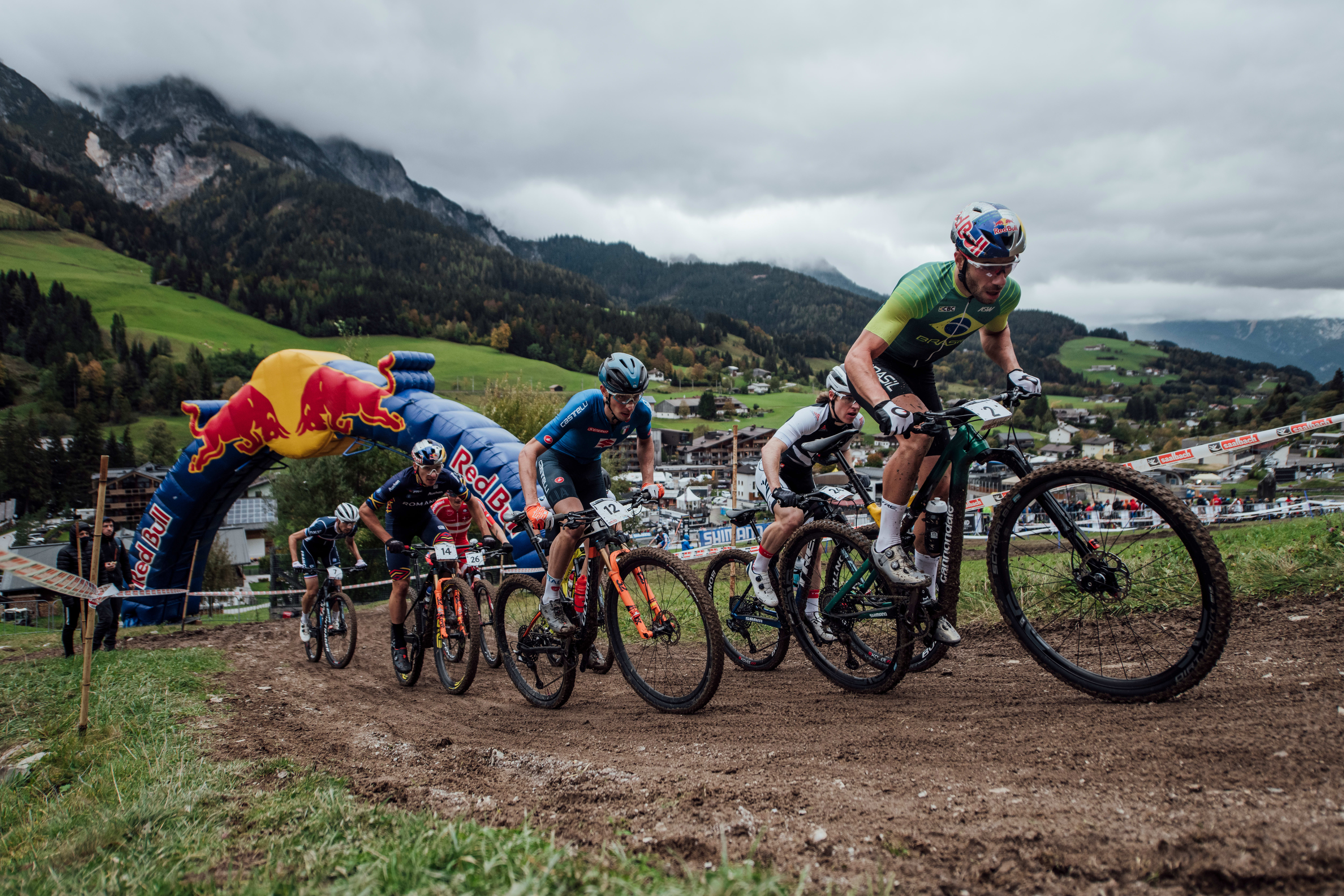 El atleta de XCO Henrique Avancini y un grupo de riders de cross-country durante el Campeonato Mundial UCI XCO en Leogang, Austria, el 10 de octubre de 2020