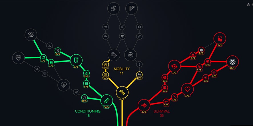 Danach kann man sich dem Conditioning-Ast widmen, der es ermöglicht, mehr Gegenstände zu tragen. Ursprünglich war der Überlebensmodus (Proficient packer auf Englisch) extrem stark, wurde jedoch aus Balance-Gründen eingeschränkt.